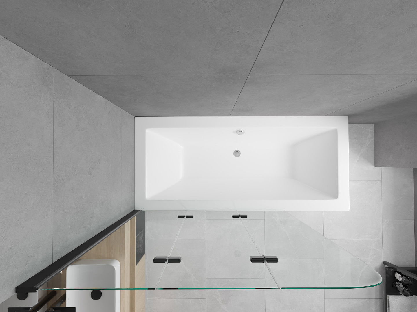 Scherm gemaakt van drie vleugels met de mogelijkheid om op te vouwen. Deze oplossing bespaart meer ruimte in de badkamer en maakt het mogelijk om de overige ruimte vrij te gebruiken wanneer we de badzone niet gebruiken.