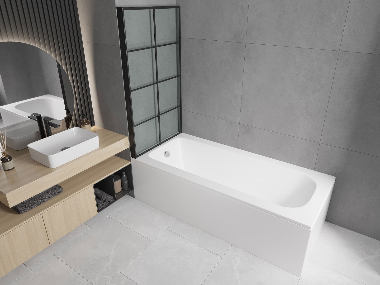 Het scherm heeft één beweegbare vleugel die kan worden opgevouwen. Deze oplossing bespaart ruimte in de badkamer en zorgt ervoor dat u de resterende ruimte vrij kunt gebruiken wanneer de badkamer niet in gebruik is.