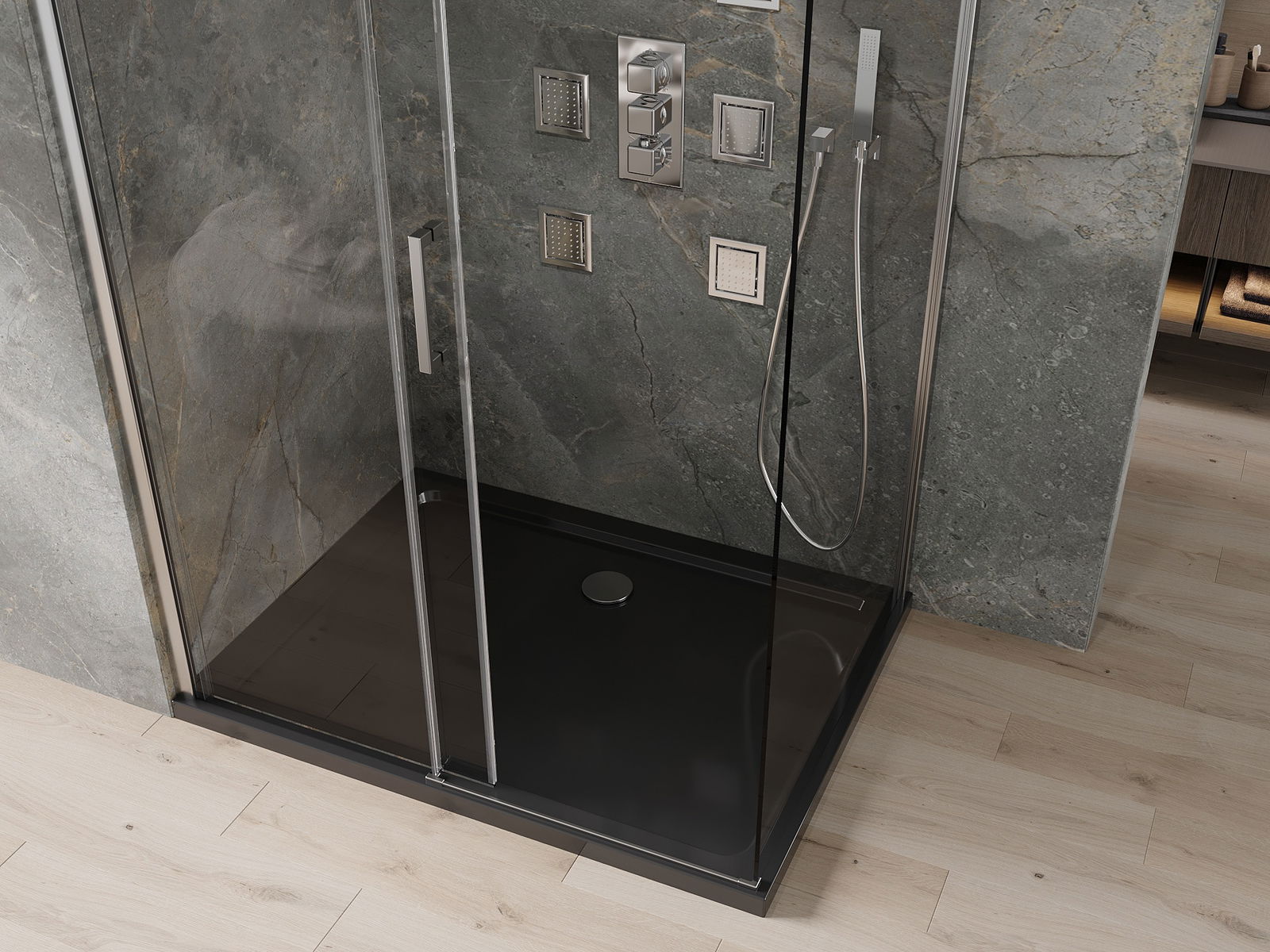 Schuifdeuren bewegen op speciale rails en hebben geen extra ruimte nodig om te openen, waardoor ze geschikt zijn voor kleinere badkamers. Dankzij dubbele metalen wielen is hun beweging soepel.