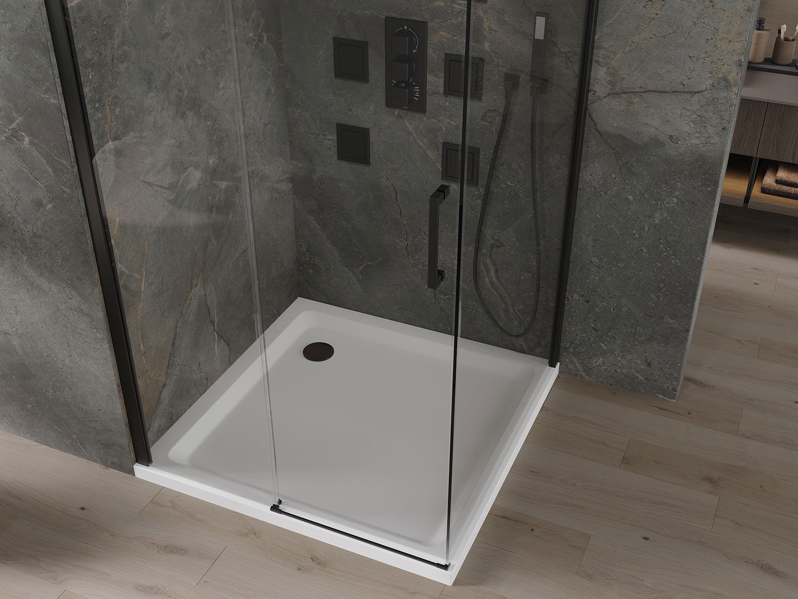 De douchebak heeft een lage drempel, waardoor u gemakkelijk in en uit de douche kunt stappen. Het voegt een unieke en tijdloze afwerking toe aan de badkamer en maakt de badkamer tot een comfortabele en esthetisch aantrekkelijke plek voor dagelijkse ontspanning.