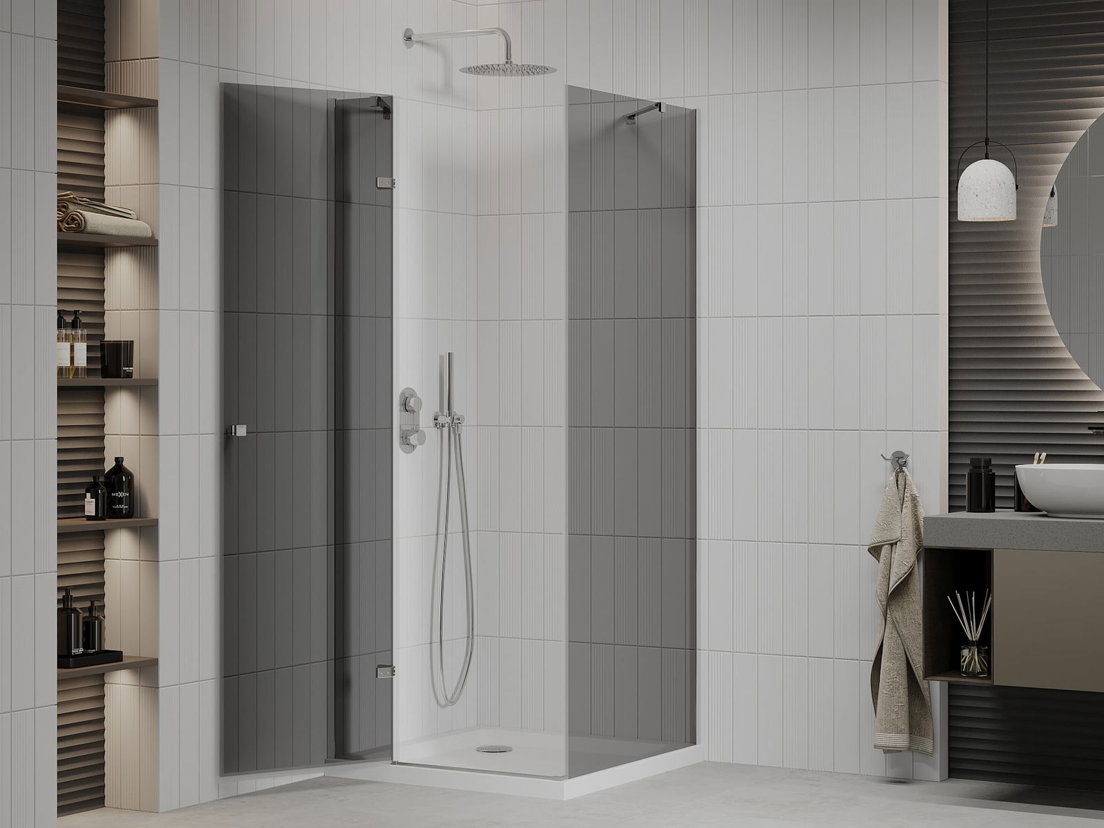 Handige en comfortabele greep is gemaakt van duurzaam en weerbestendig metaal. De modieuze vorm in combinatie met een afwerking die past bij de kleur van de profielen geeft het geheel een moderne en stijlvolle uitstraling, wat de esthetiek van elke badkamer benadrukt.