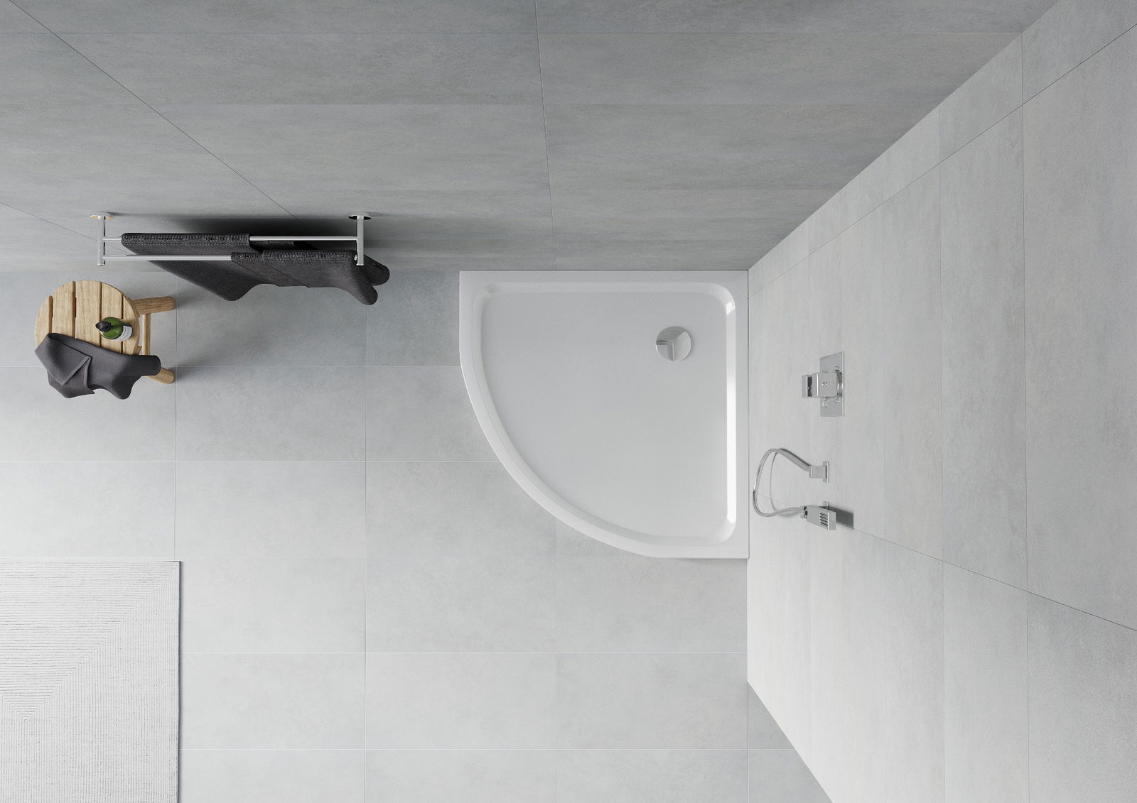 De douchebak is zo ontworpen dat het water vrij kan weglopen in de richting van de afvoer. Het zorgt voor een snelle en efficiënte afvoer van water van het oppervlak van de douchebak, waardoor het ontstaan van plassen en het overstromen van de badkamer wordt voorkomen.