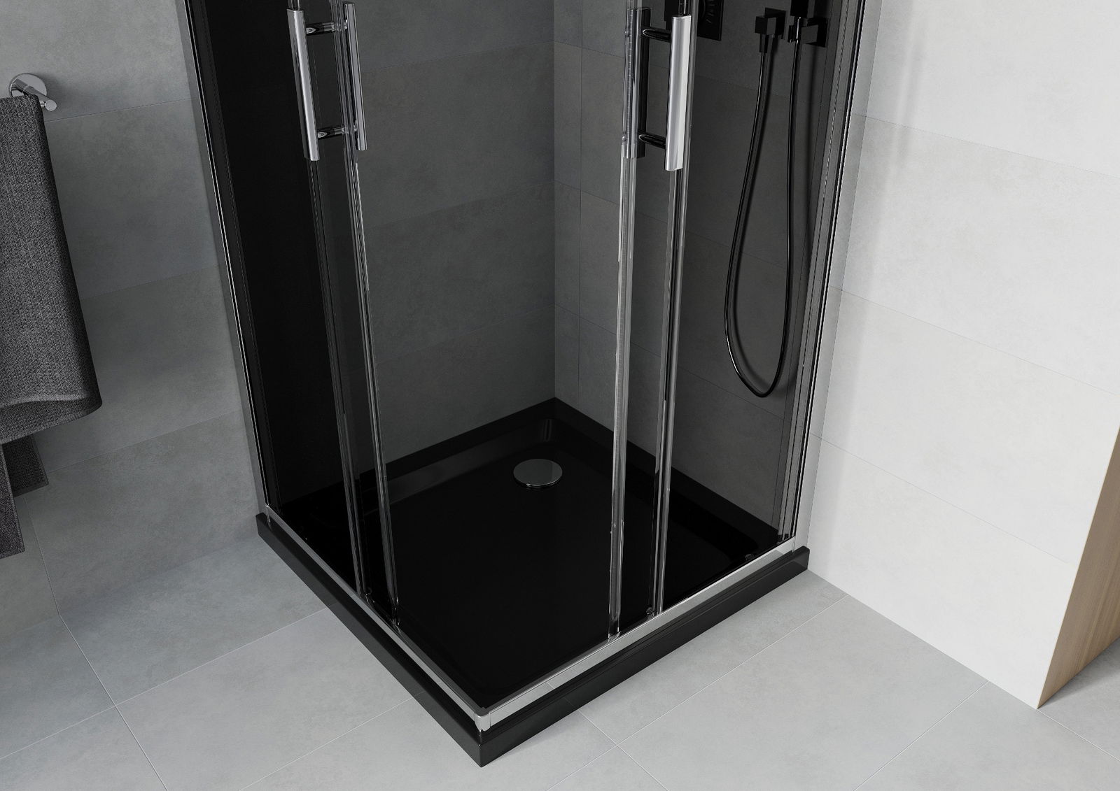 Handige en comfortabele greep is gemaakt van duurzaam en weerbestendig metaal. De modieuze vorm in combinatie met een afwerking die past bij de kleur van de profielen geeft het geheel een moderne en stijlvolle uitstraling, wat de esthetiek van elke badkamer benadrukt.