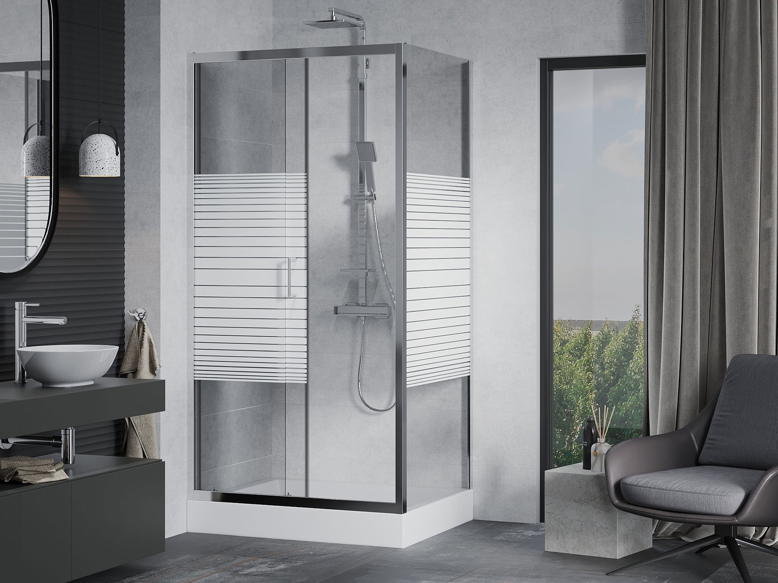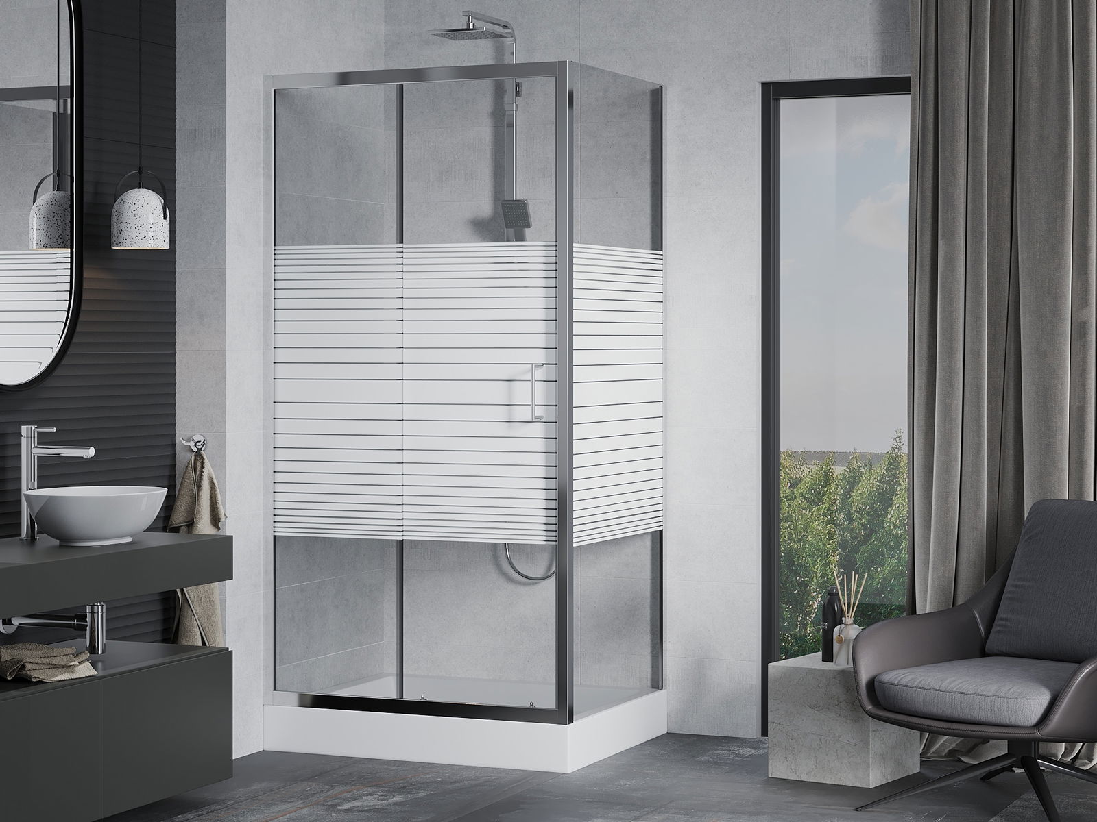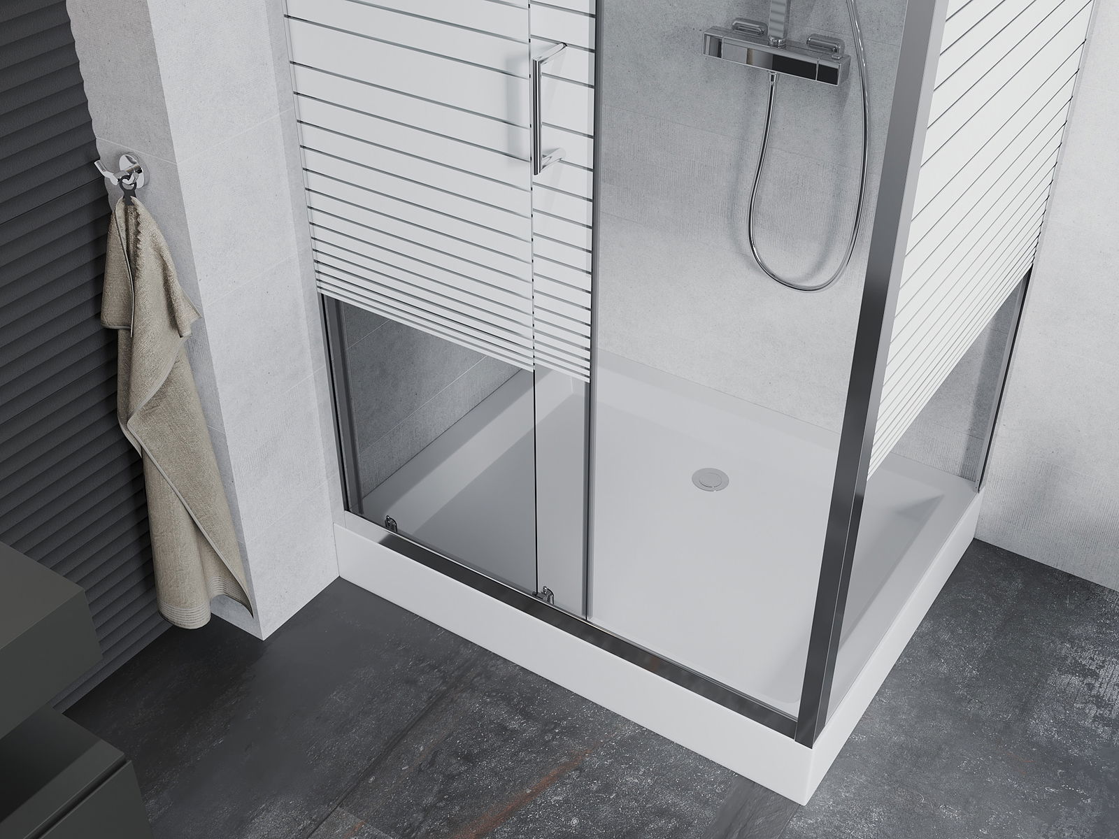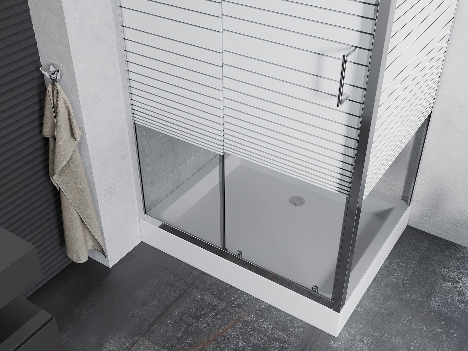 Handige en comfortabele greep is gemaakt van duurzaam en weerbestendig metaal. De modieuze vorm in combinatie met een afwerking die past bij de kleur van de profielen geeft het geheel een moderne en stijlvolle uitstraling, wat de esthetiek van elke badkamer benadrukt.