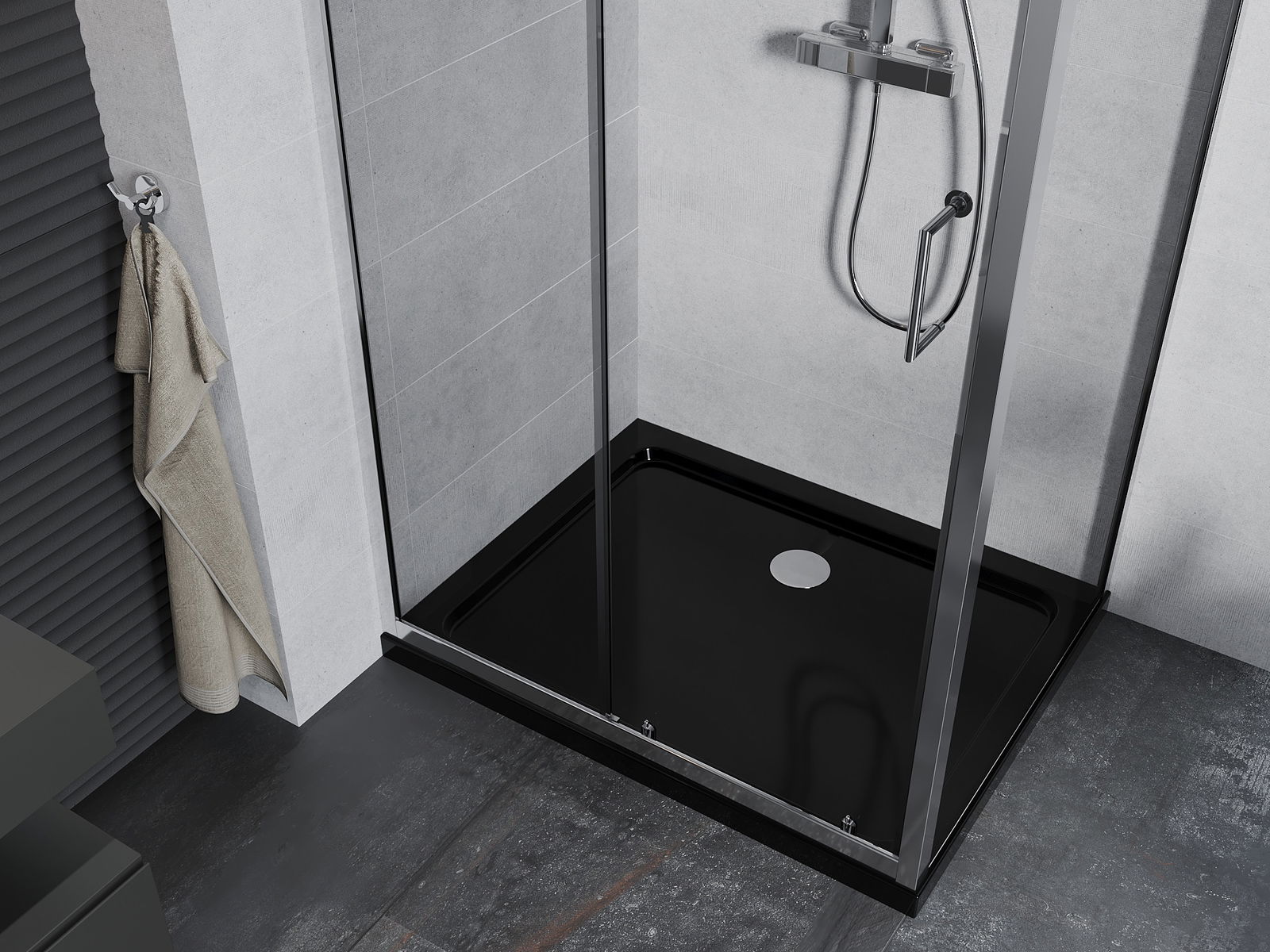 Handige en comfortabele greep is gemaakt van duurzaam en weerbestendig metaal. De modieuze vorm in combinatie met een afwerking die past bij de kleur van de profielen geeft het geheel een moderne en stijlvolle uitstraling, wat de esthetiek van elke badkamer benadrukt.
