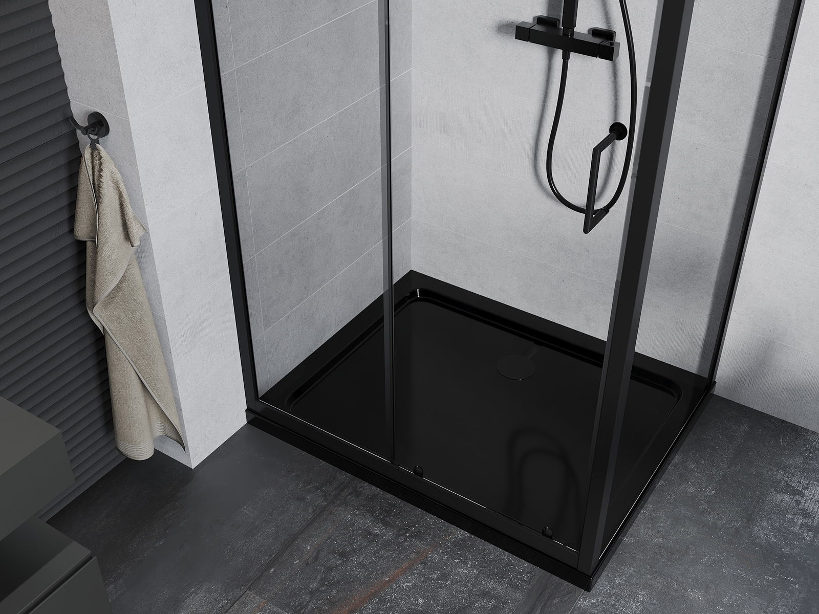 Handige en comfortabele greep is gemaakt van duurzaam en weerbestendig metaal. De modieuze vorm in combinatie met een afwerking die past bij de kleur van de profielen geeft het geheel een moderne en stijlvolle uitstraling, wat de esthetiek van elke badkamer benadrukt.