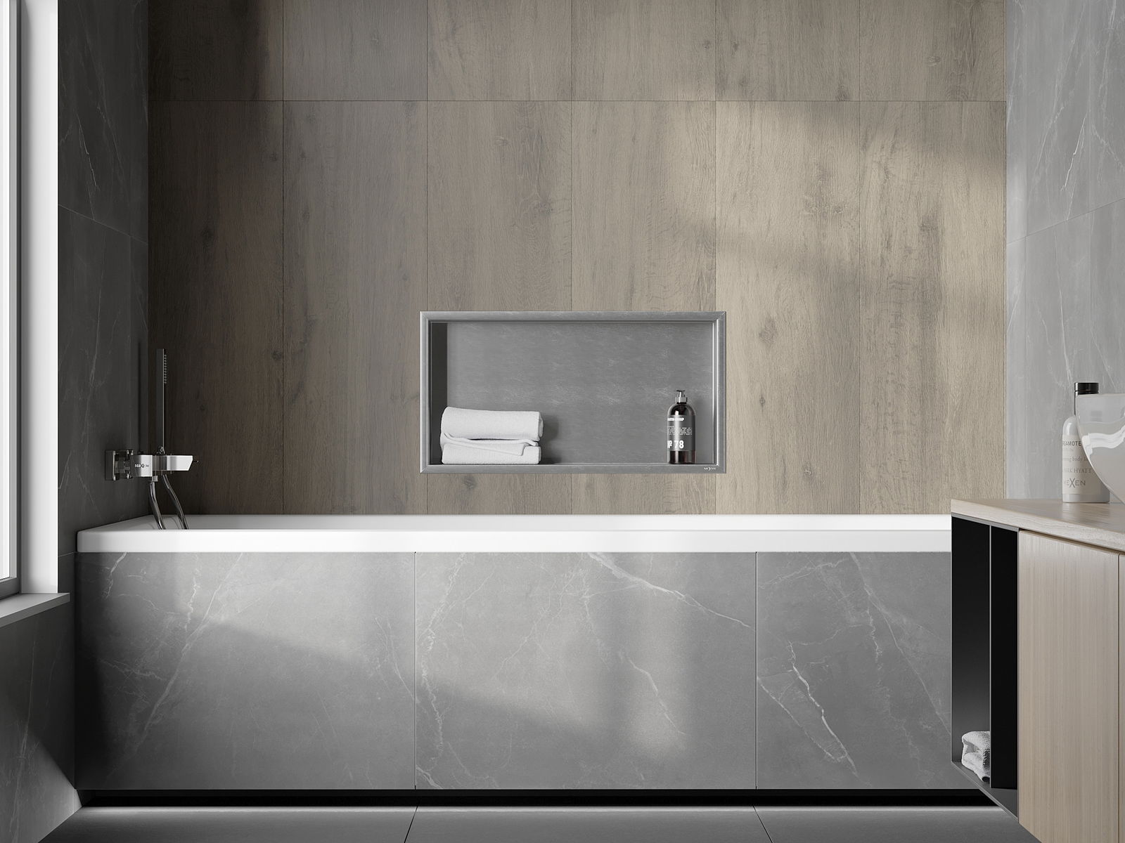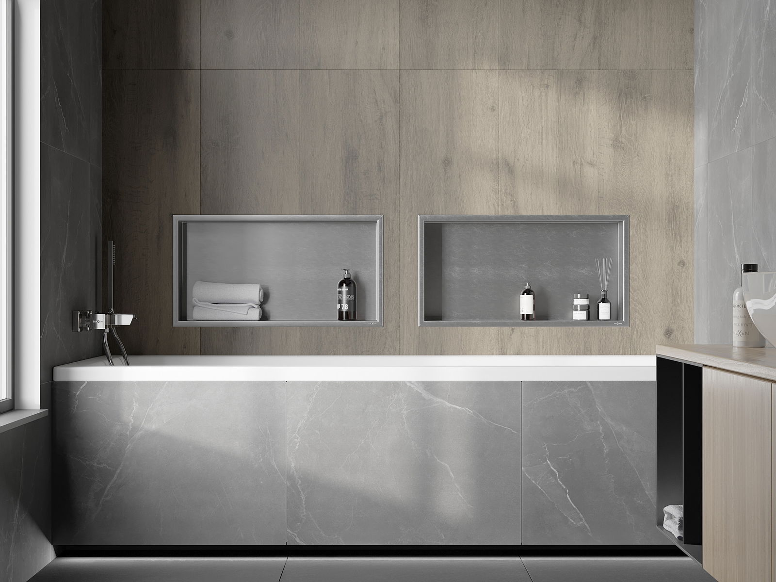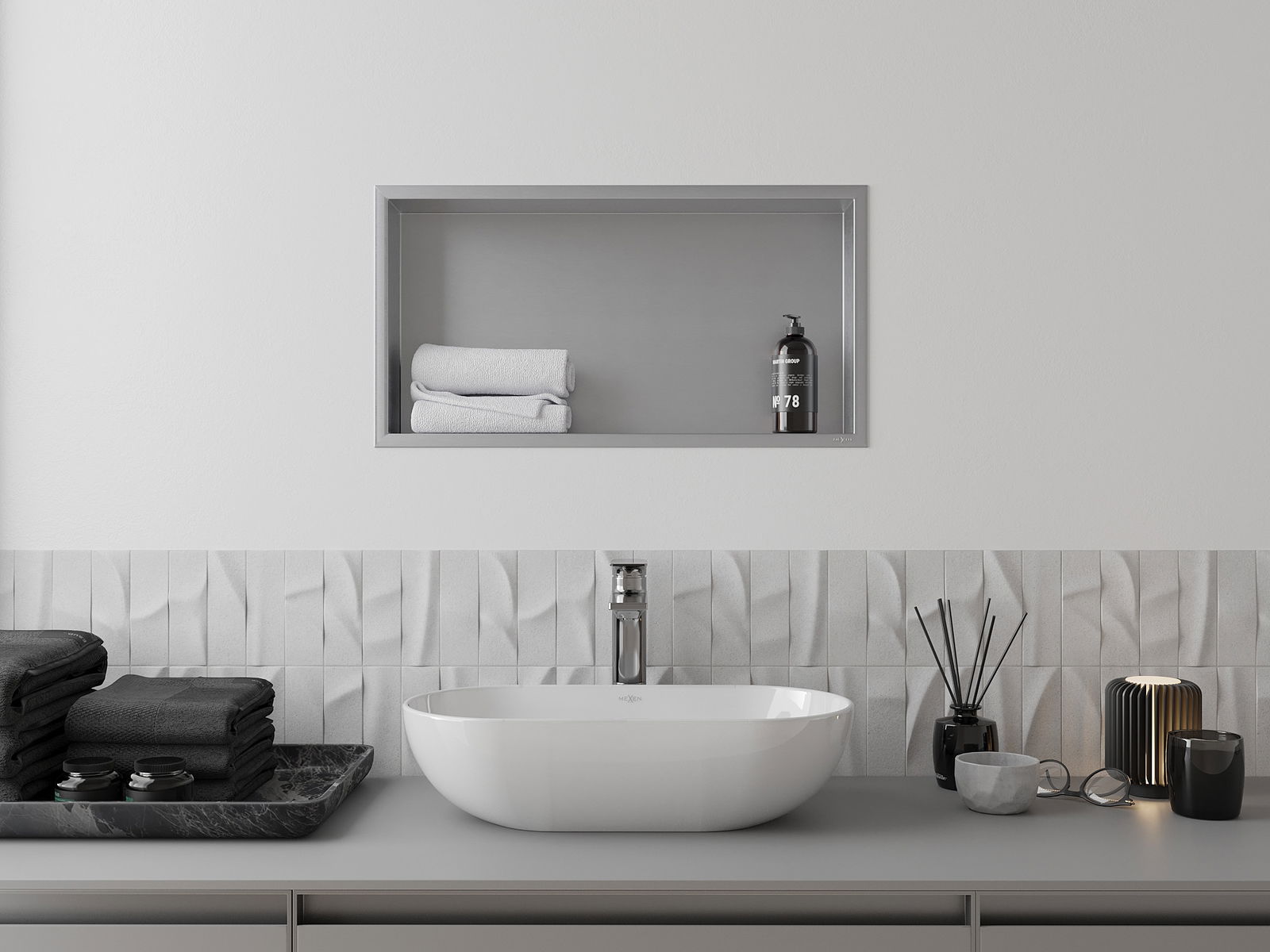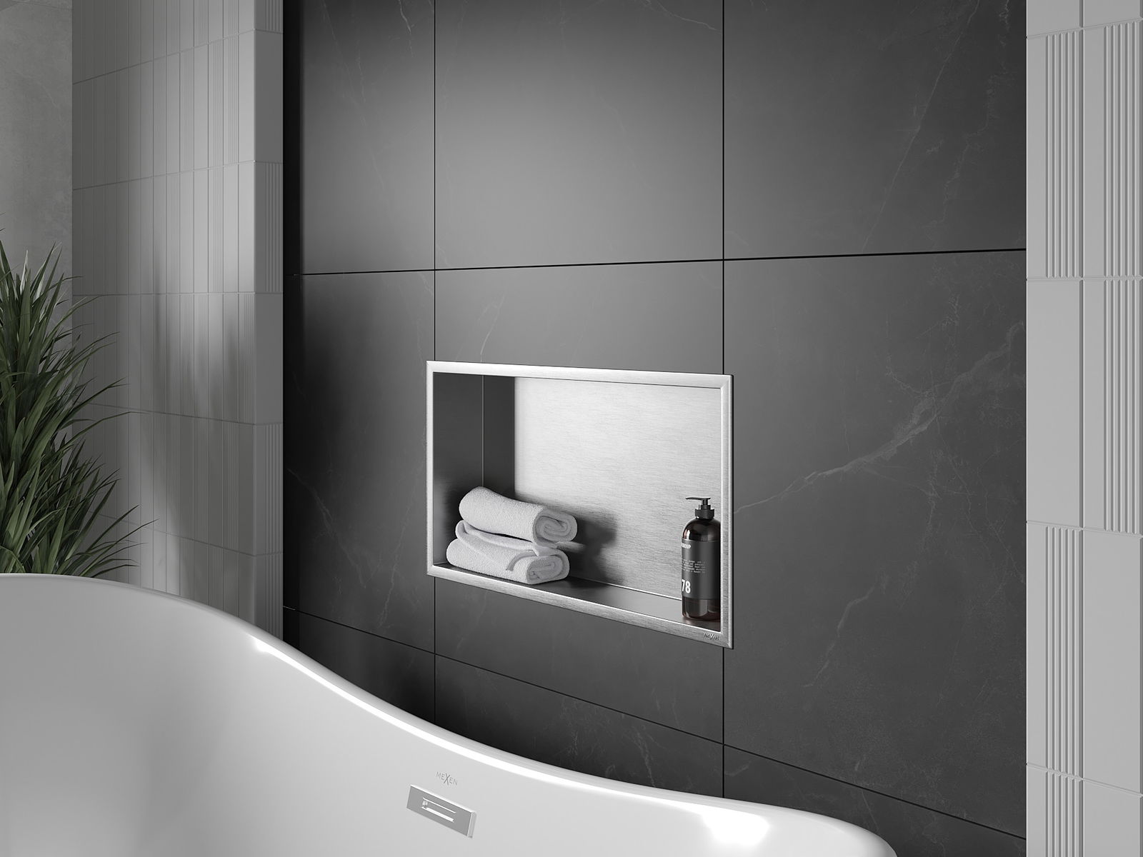 Mogelijkheid voor installatie in de muur of in speciaal voorbereide bekleding. Dit is een uiterst moderne en functionele oplossing, waardoor u ruimte kunt besparen en het product kunt aanpassen aan de esthetiek van het interieur en een samenhangende compositie kunt creëren.