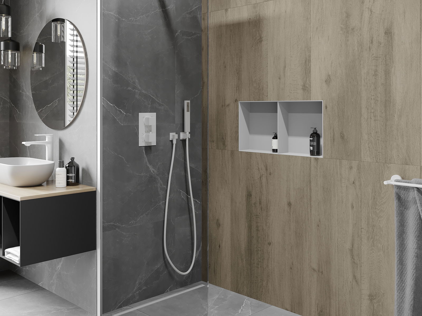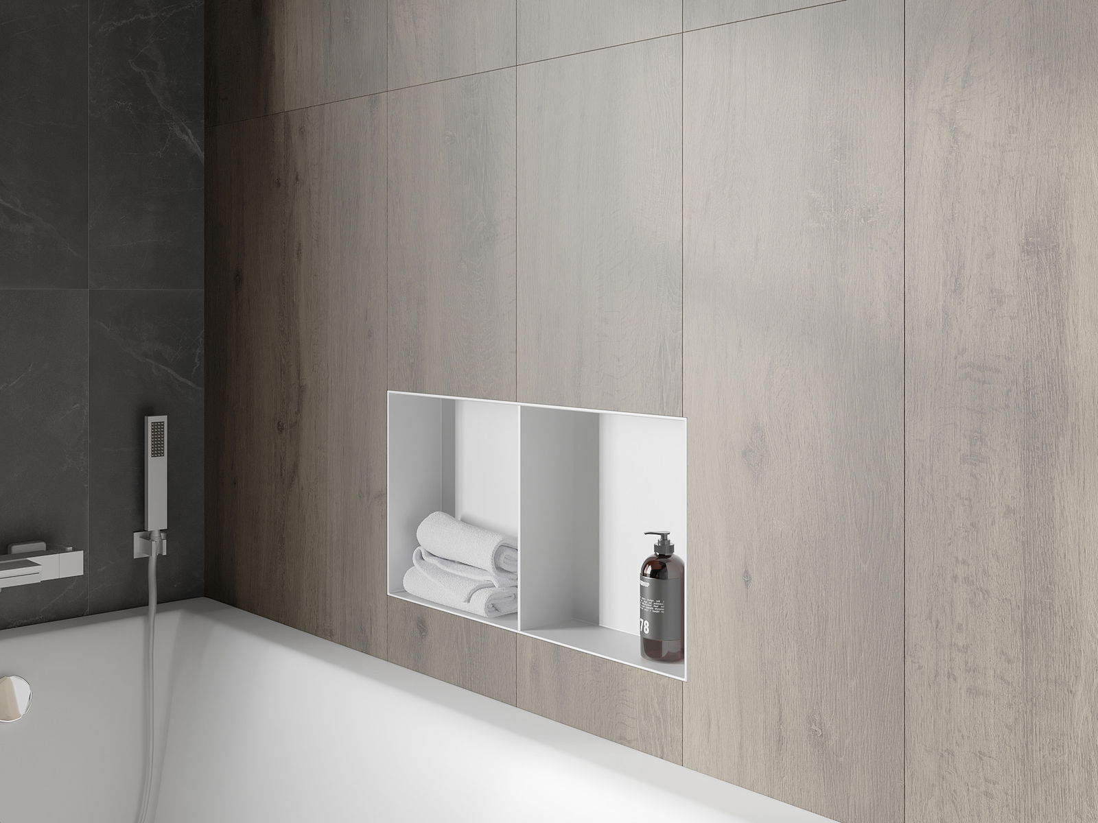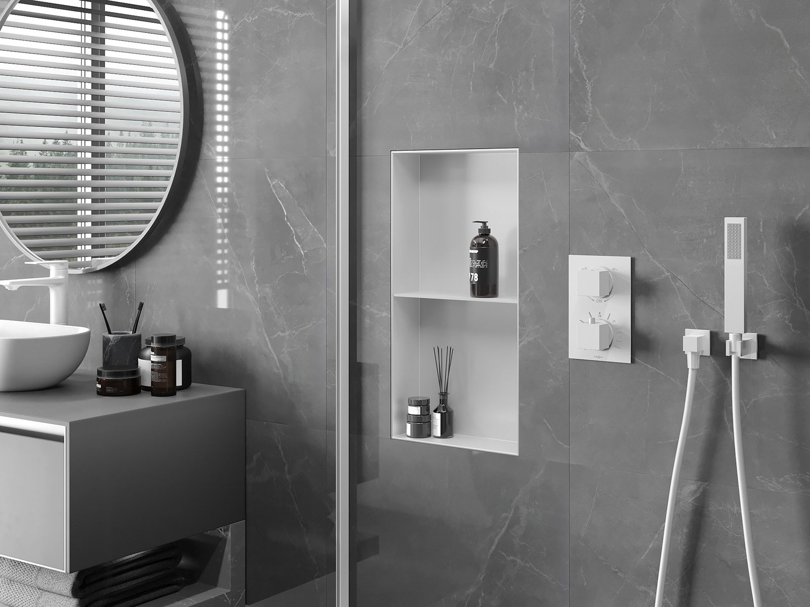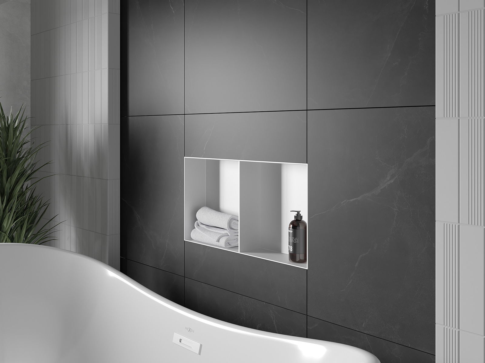 Mogelijkheid voor installatie in de muur of in speciaal voorbereide bekleding. Dit is een uiterst moderne en functionele oplossing, waardoor u ruimte kunt besparen en het product kunt aanpassen aan de esthetiek van het interieur en een samenhangende compositie kunt creëren.