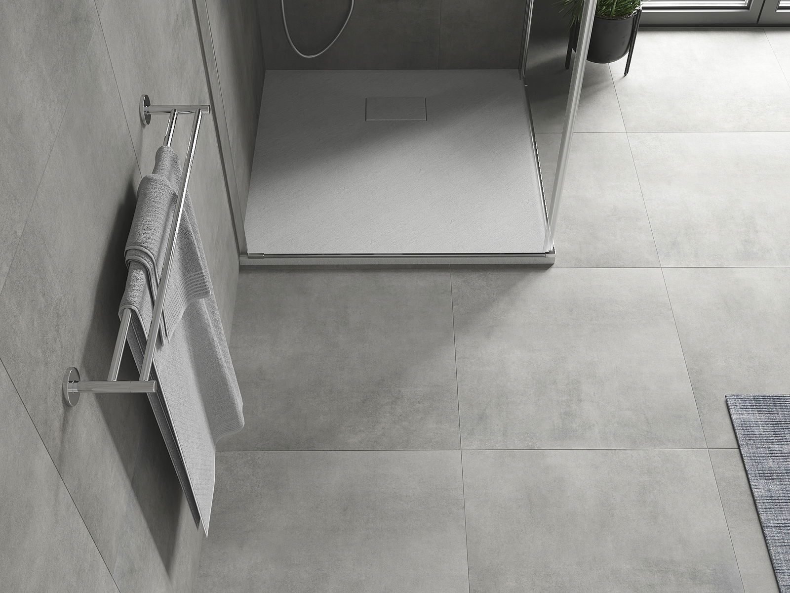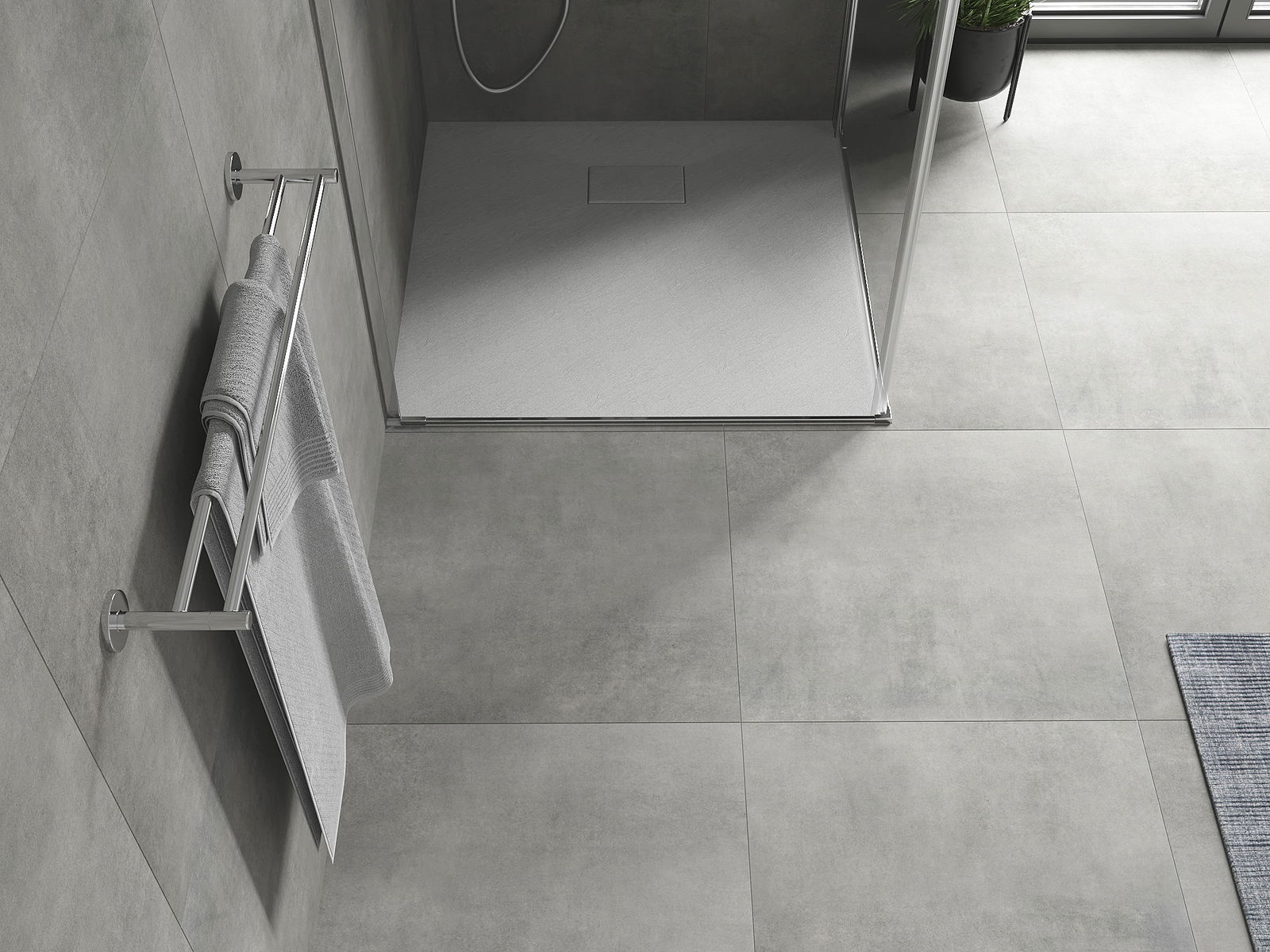Het oppervlak van de douchebak doet met zijn structuur denken aan steen. Het vormt een uitzonderlijke combinatie van een natuurlijke uitstraling met een moderne interieurinrichting. Het voegt karakter toe, benadrukt de esthetiek en elegantie van de badkamerinrichting en verrast met zijn vorm.