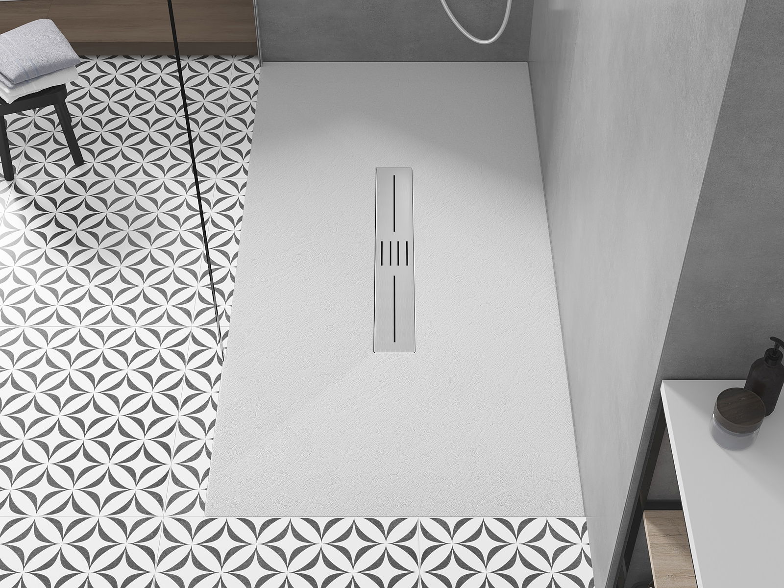 Het oppervlak van de douchebak doet met zijn structuur denken aan steen. Het vormt een uitzonderlijke combinatie van een natuurlijke uitstraling met een moderne interieurinrichting. Het voegt karakter toe, benadrukt de esthetiek en elegantie van de badkamerinrichting en verrast met zijn vorm.