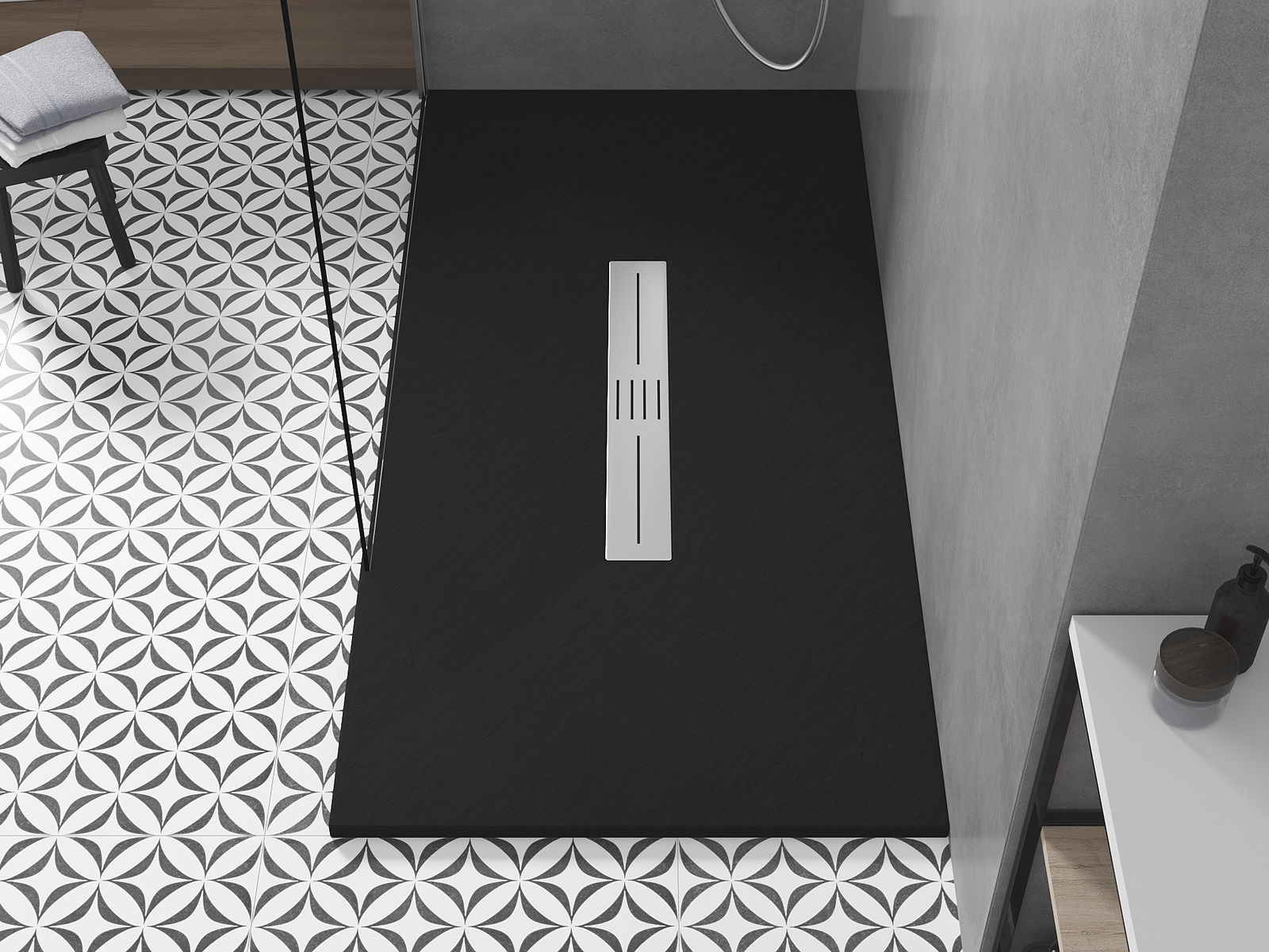 Het oppervlak van de douchebak doet met zijn structuur denken aan steen. Het vormt een uitzonderlijke combinatie van een natuurlijke uitstraling met een moderne interieurinrichting. Het voegt karakter toe, benadrukt de esthetiek en elegantie van de badkamerinrichting en verrast met zijn vorm.