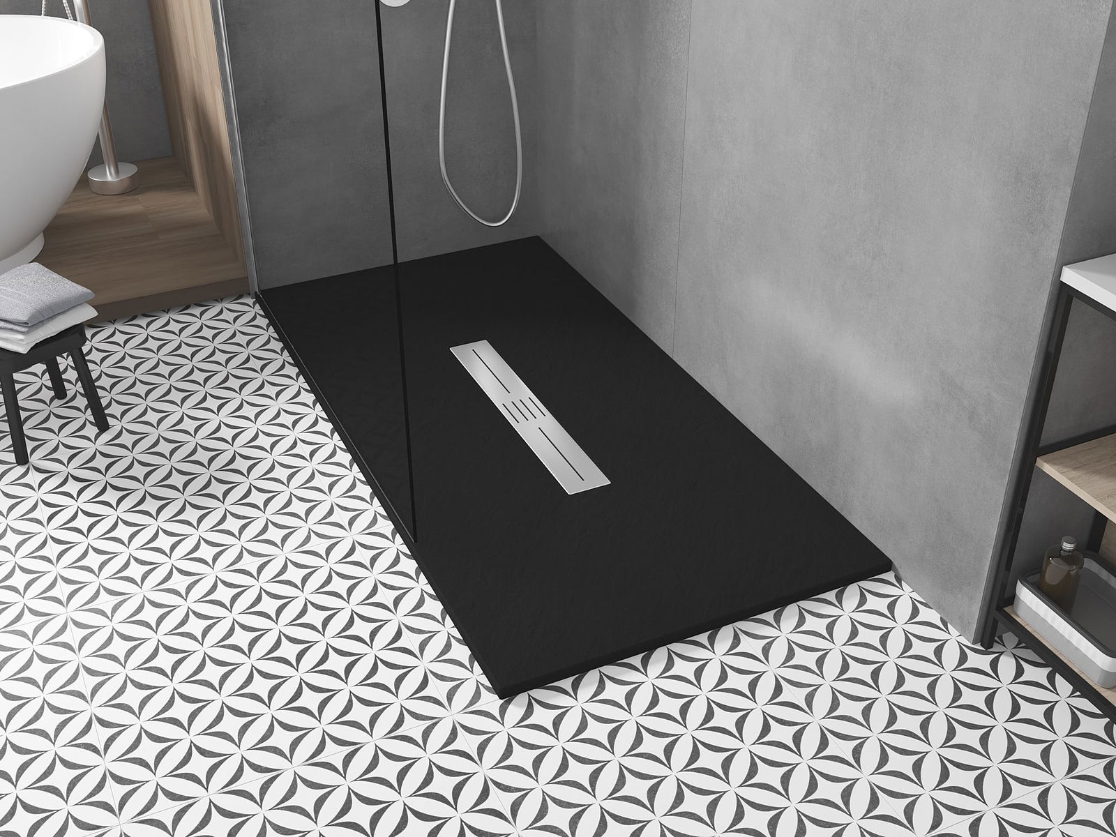 Het oppervlak van de douchebak doet met zijn structuur denken aan steen. Het vormt een uitzonderlijke combinatie van een natuurlijke uitstraling met een moderne interieurinrichting. Het voegt karakter toe, benadrukt de esthetiek en elegantie van de badkamerinrichting en verrast met zijn vorm.