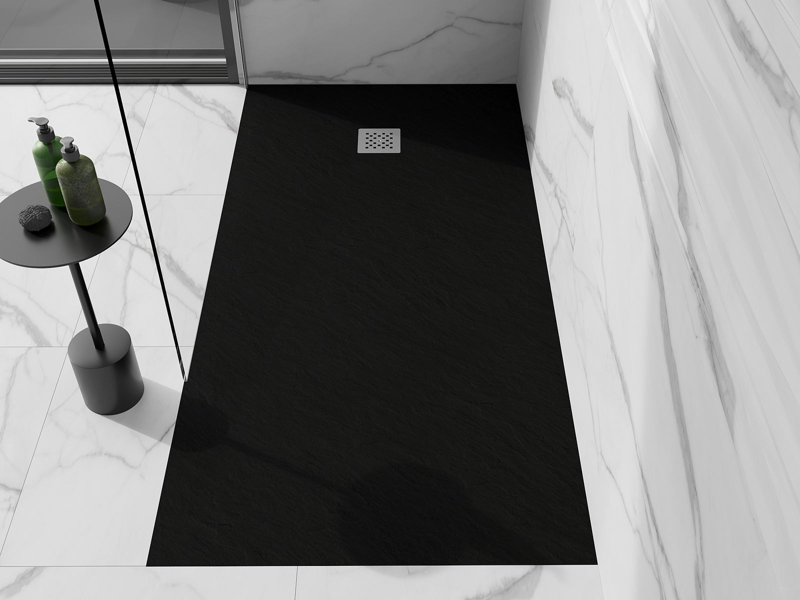 De douchebak is zo ontworpen dat het water vrij kan weglopen in de richting van de afvoer. Het zorgt voor een snelle en efficiënte afvoer van water van het oppervlak van de douchebak, waardoor het ontstaan van plassen en het overstromen van de badkamer wordt voorkomen.