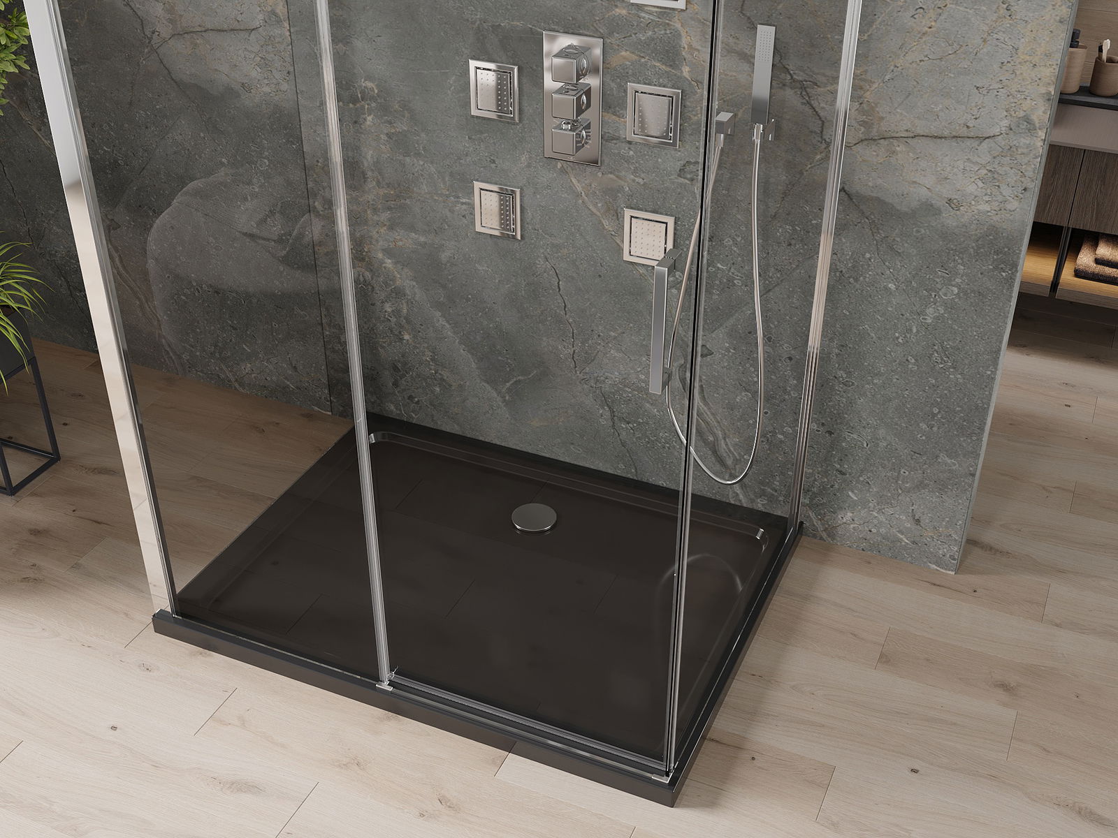 Schuifdeuren bewegen op speciale rails en hebben geen extra ruimte nodig om te openen, waardoor ze geschikt zijn voor kleinere badkamers. Dankzij dubbele metalen wielen is hun beweging soepel.