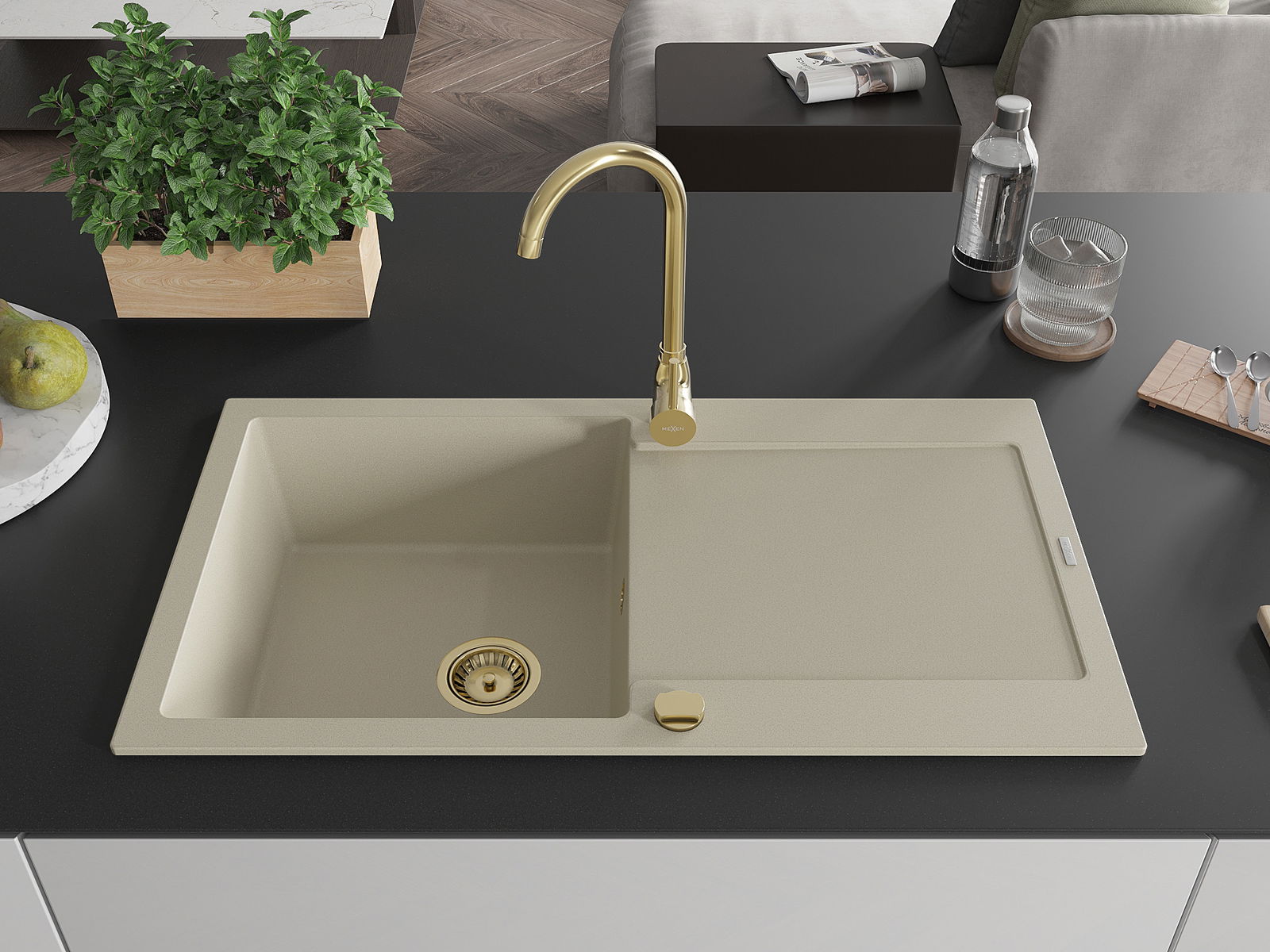 Het oppervlak van de spoelbak is vlek- en vlekbestendig, waardoor hij gemakkelijk schoon te houden is en jarenlang zijn kleur behoudt. Het is een esthetisch aantrekkelijke en praktische toevoeging aan elke keuken.