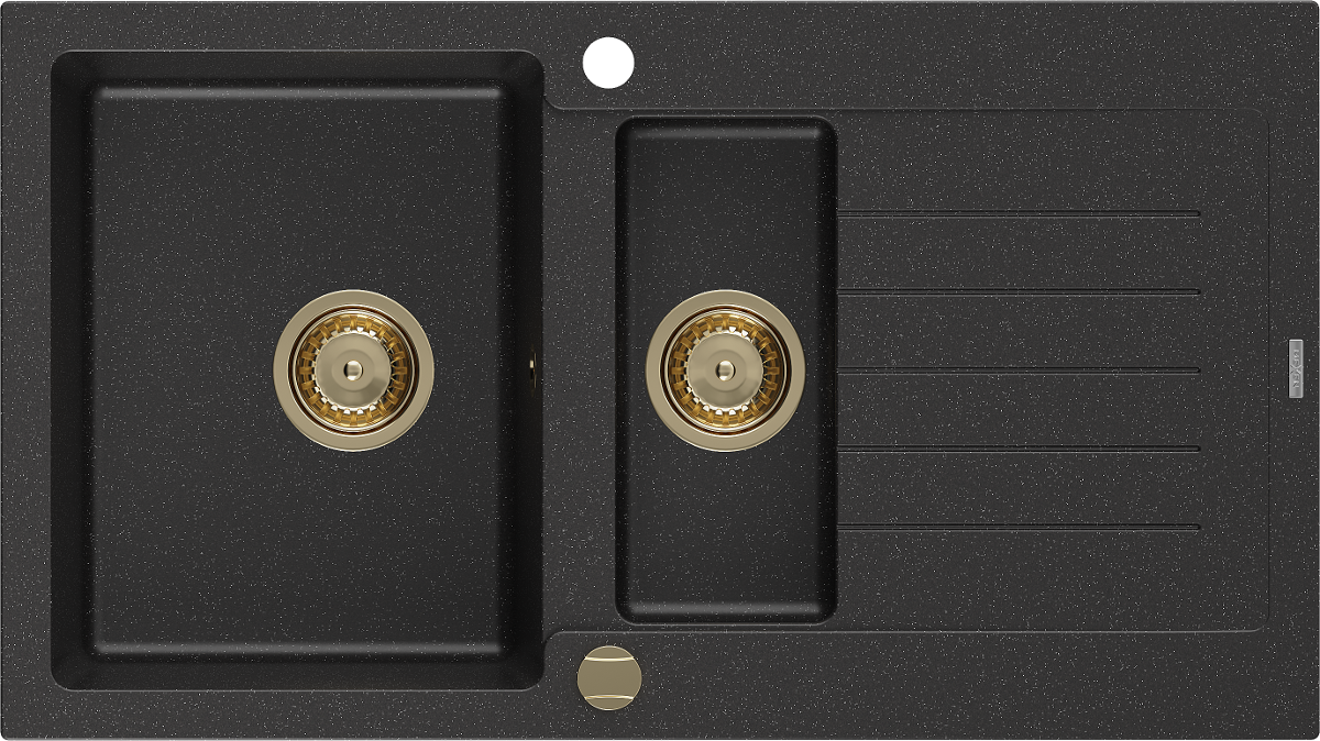 Mexen Matias granieten spoelbak 1,5-komor met afdruiprek 900 x 505 mm, zwart/zilveren metallic, gouden sifon - 6502901505-73-G