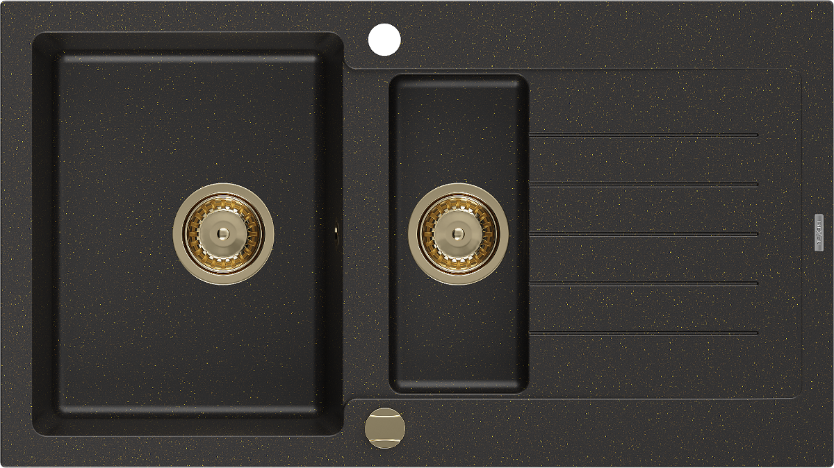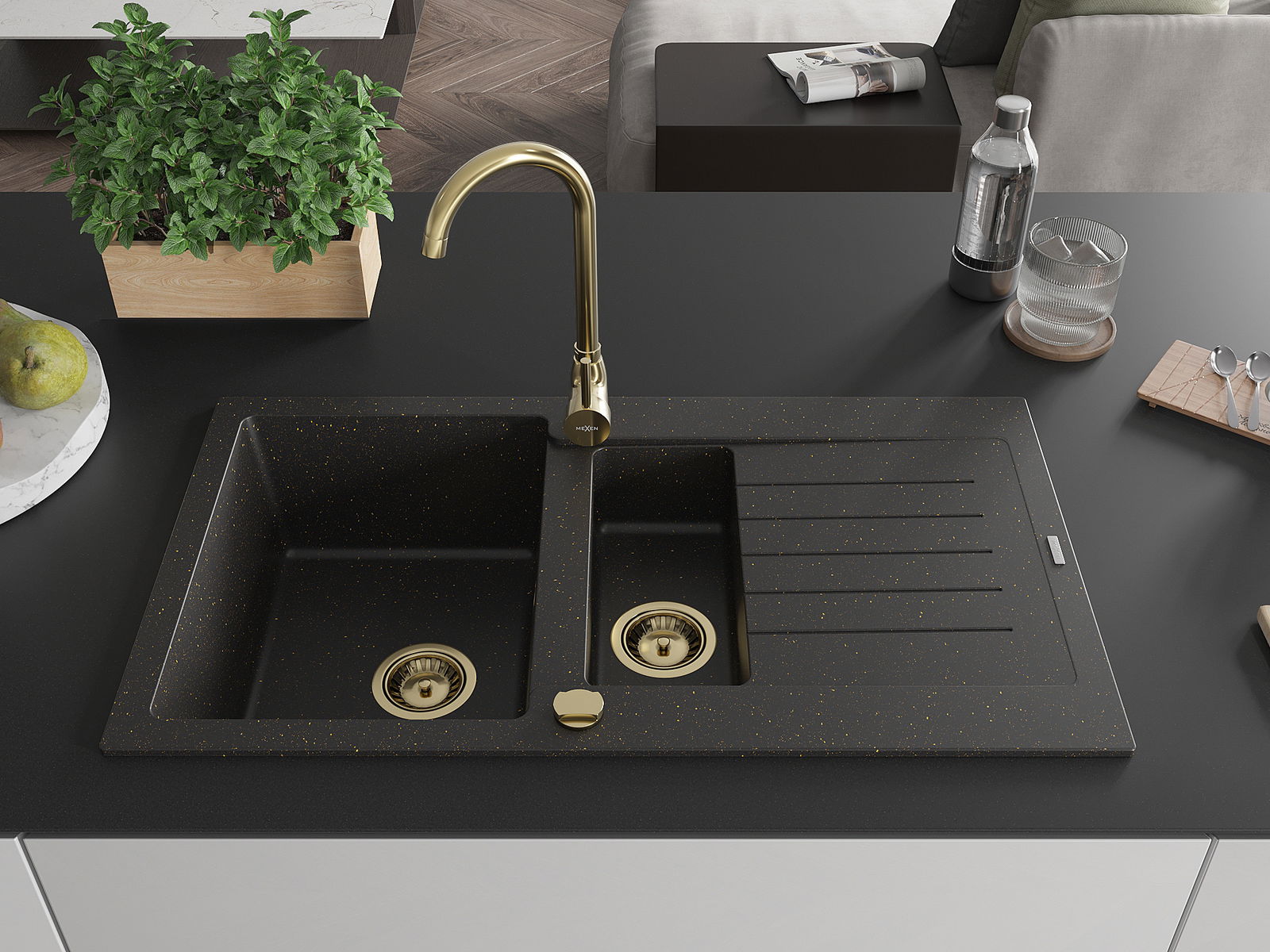 Mexen Matias granieten spoelbak met 1,5 bak en afdruiprek 900 x 505 mm, zwart/goud metallic, gouden sifon - 6502901505-75-G