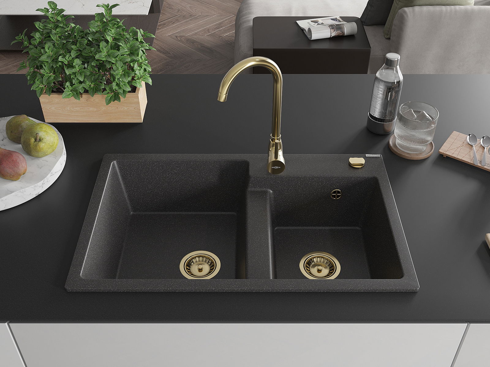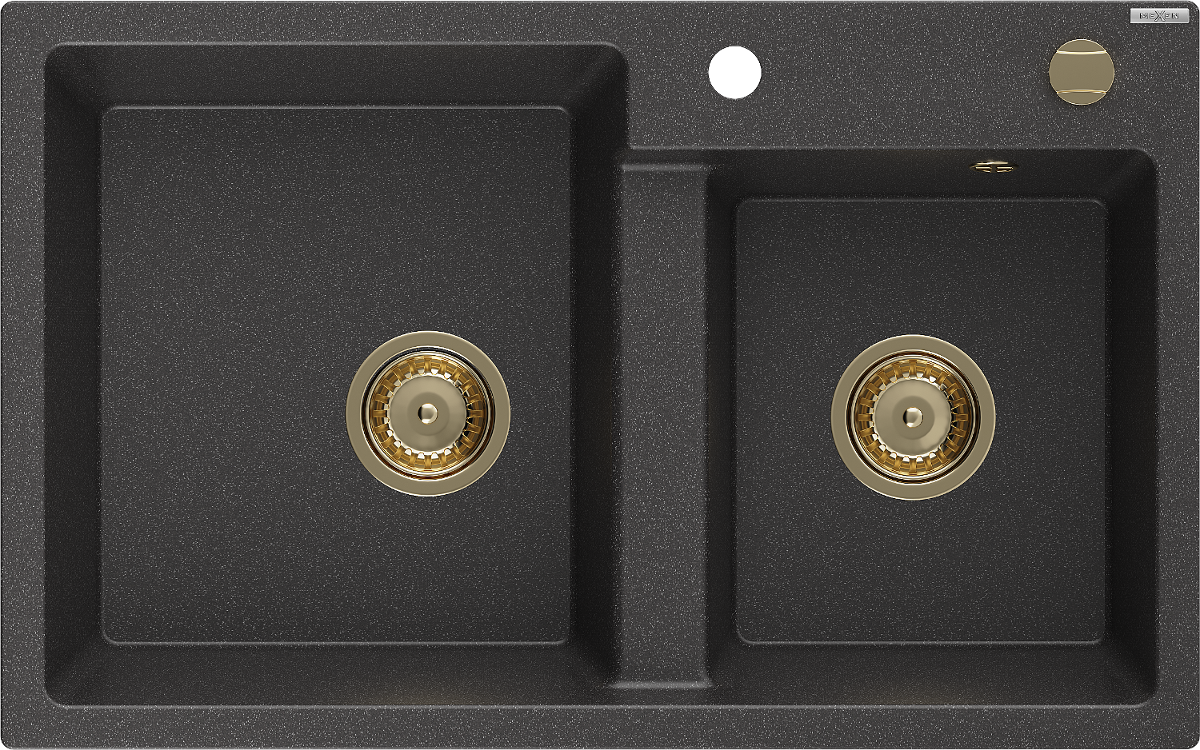 Mexen Tomas granieten spoelbak 2-kamers 800 x 500 mm, zwart gespikkeld, gouden sifon - 6516802000-76-G