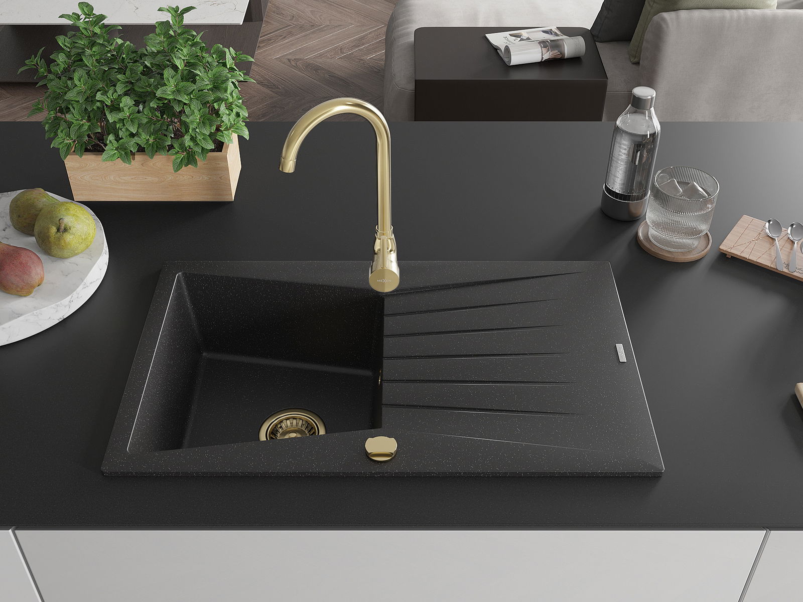 Mexen Cesar granieten spoelbak 1-kompartiment met afdruiprek 775 x 470 mm, zwart/zilveren metallic, gouden sifon - 6514771010-7?