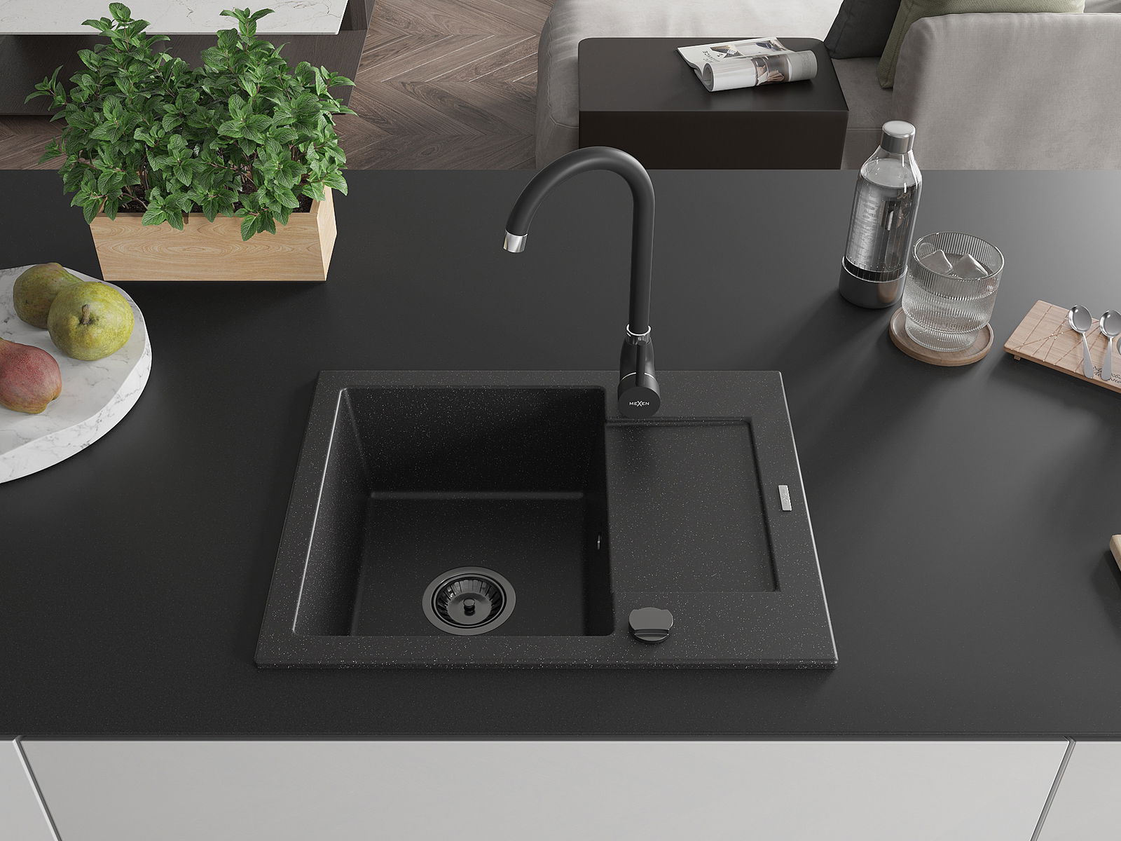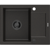 Mexen Enzo granieten gootsteen 1-kompartment met afdruiprek 576 x 465 mm, zwart/zilver metallic, zwarte sifon - 6506571005-73-B