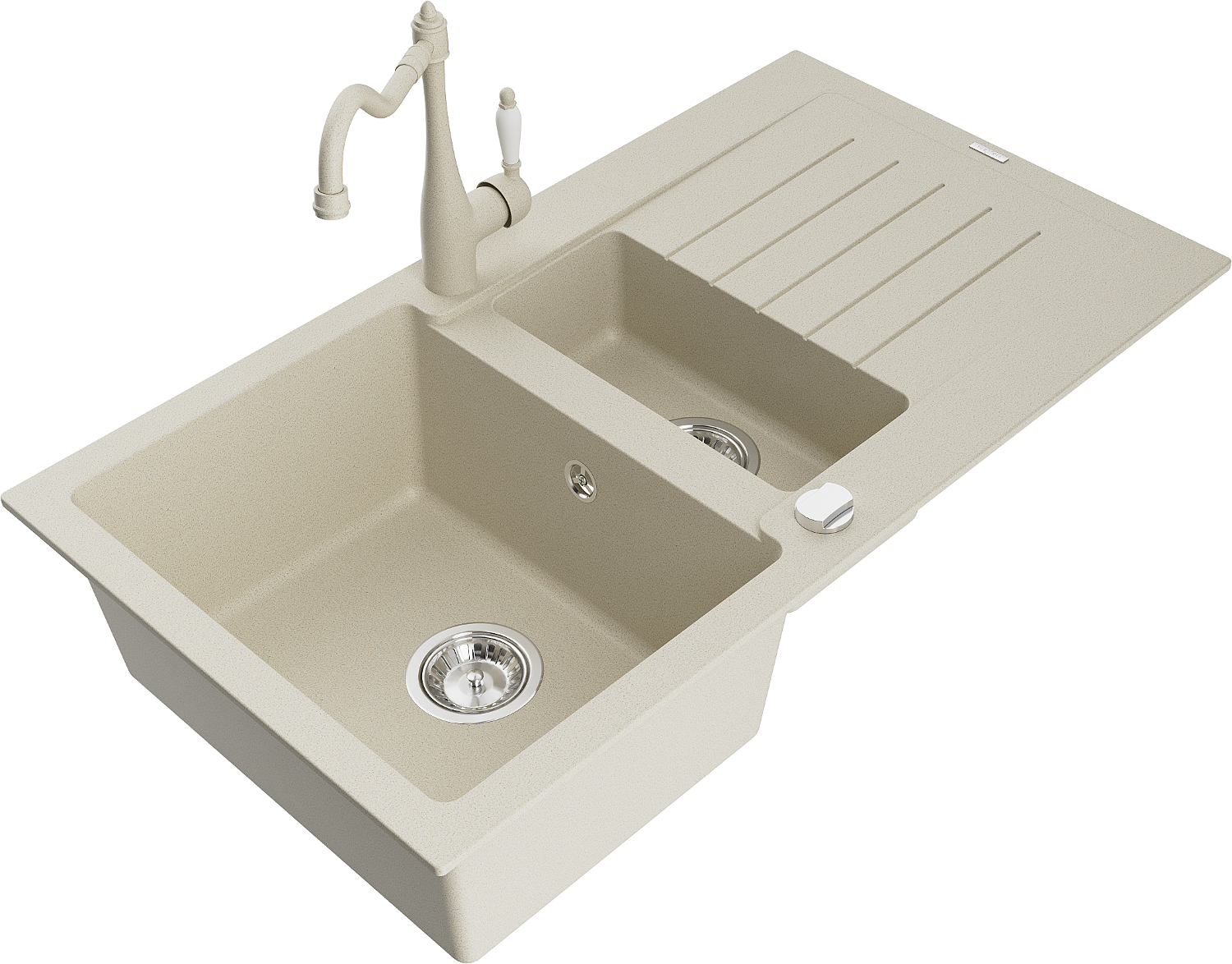 Mexen Matias granieten gootsteen 1,5-komorige met afdruiprek en keukenmengkraan Carla, beige - 6502-69-670700-69
