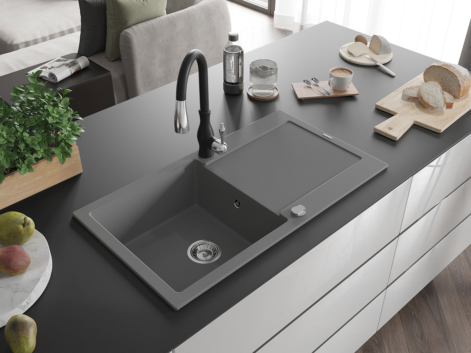 De gootsteen is gemaakt van hoogwaardig graniet. Het vormt een elegante en vooral praktische aanvulling op elke keuken, ongeacht de stijl. De hoge kwaliteit en duurzaamheid van graniet zorgen voor jarenlang gebruik.