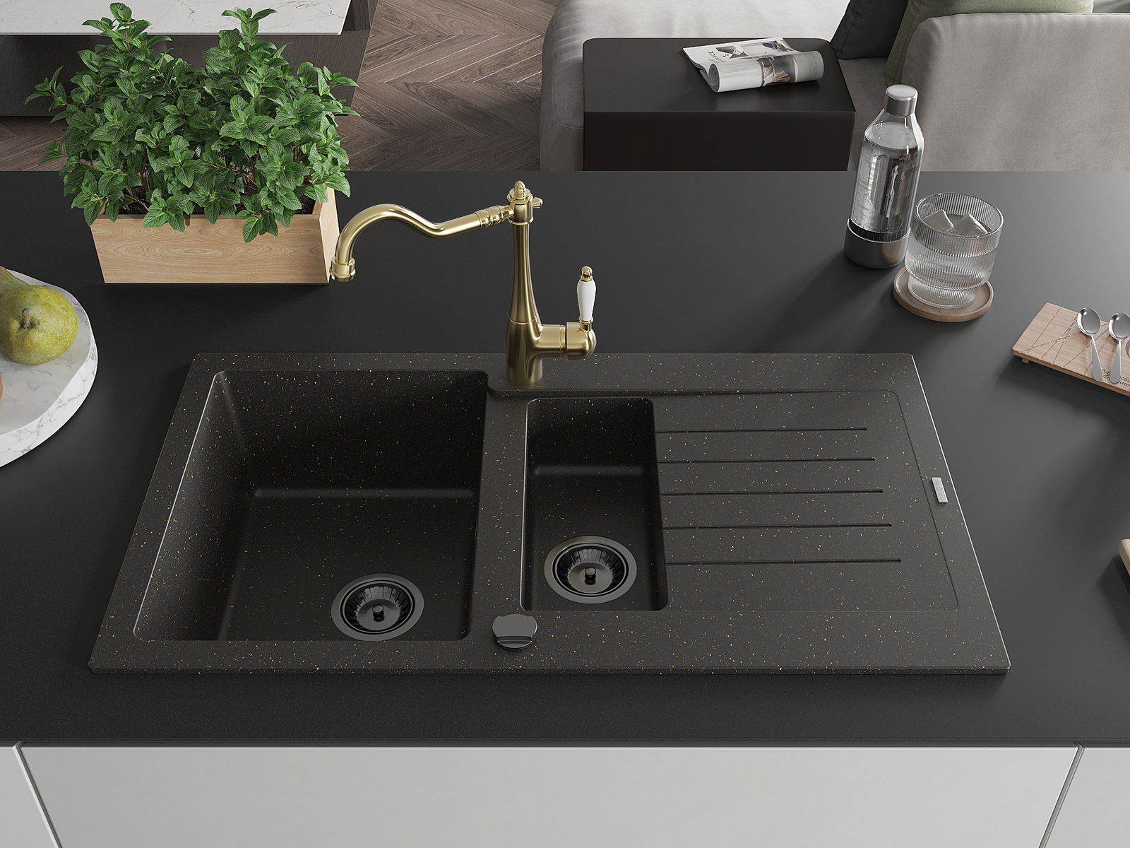 Mexen Matias granieten spoelbak 1,5-komor met afdruiprek en keukenmengkraan Carla zwart/goud metallic - 6502-75-670700-50-B