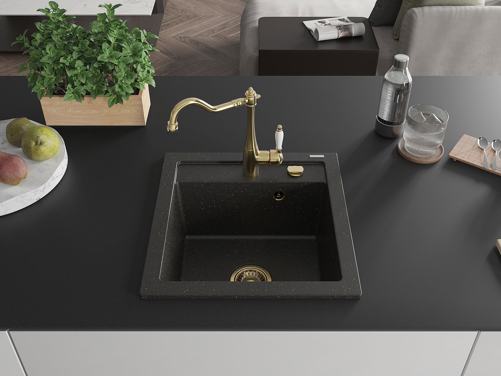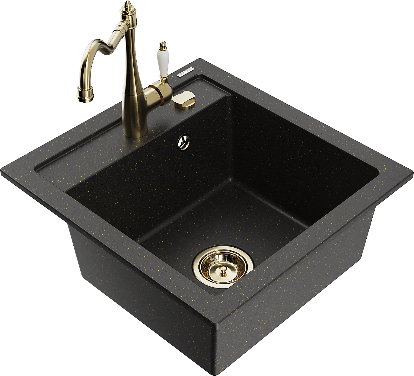 Mexen Vito granieten gootsteen 1-komor met keukenkraan Carla, zwart/gouden metallic - 6503-75-670700-50