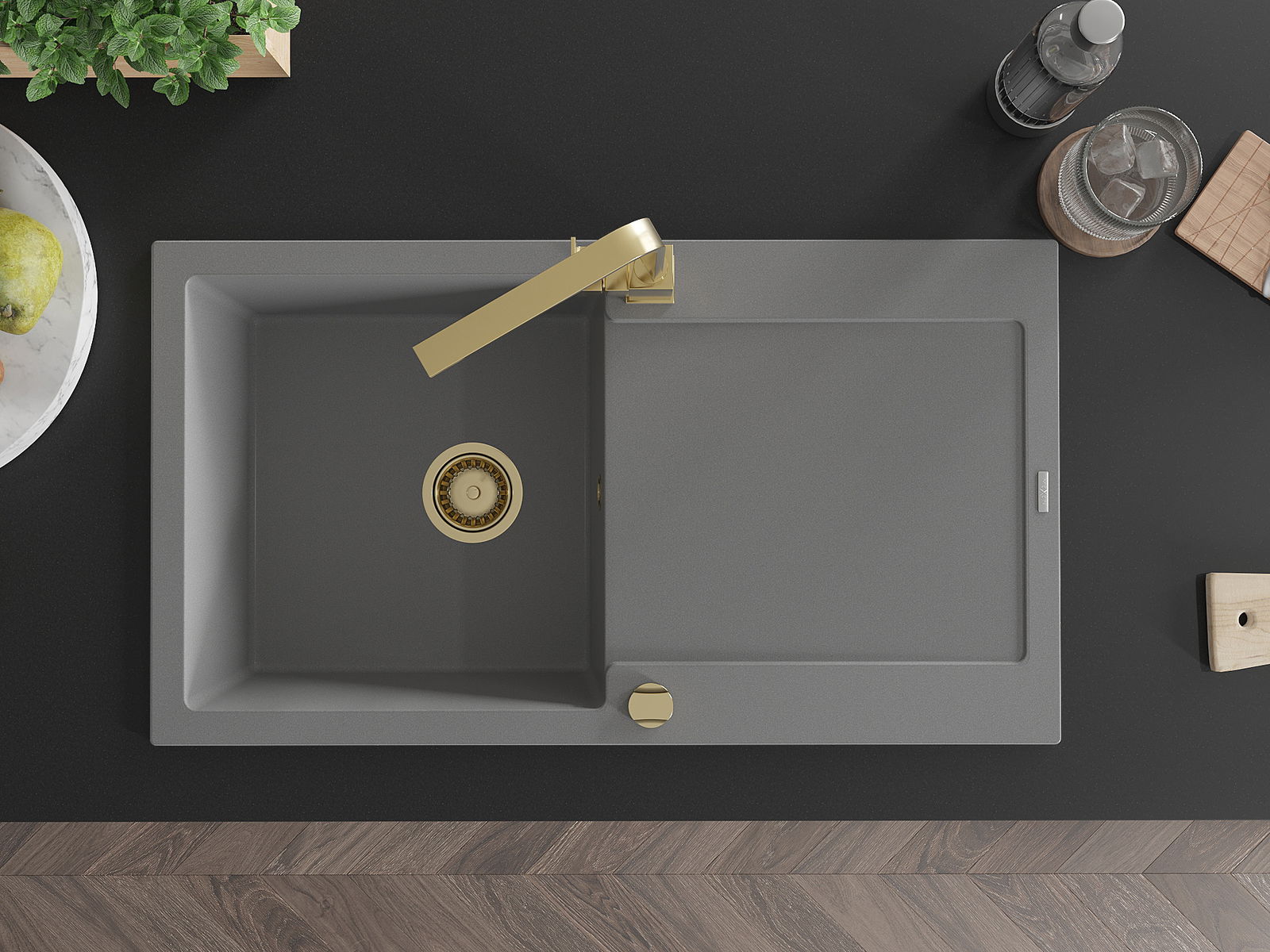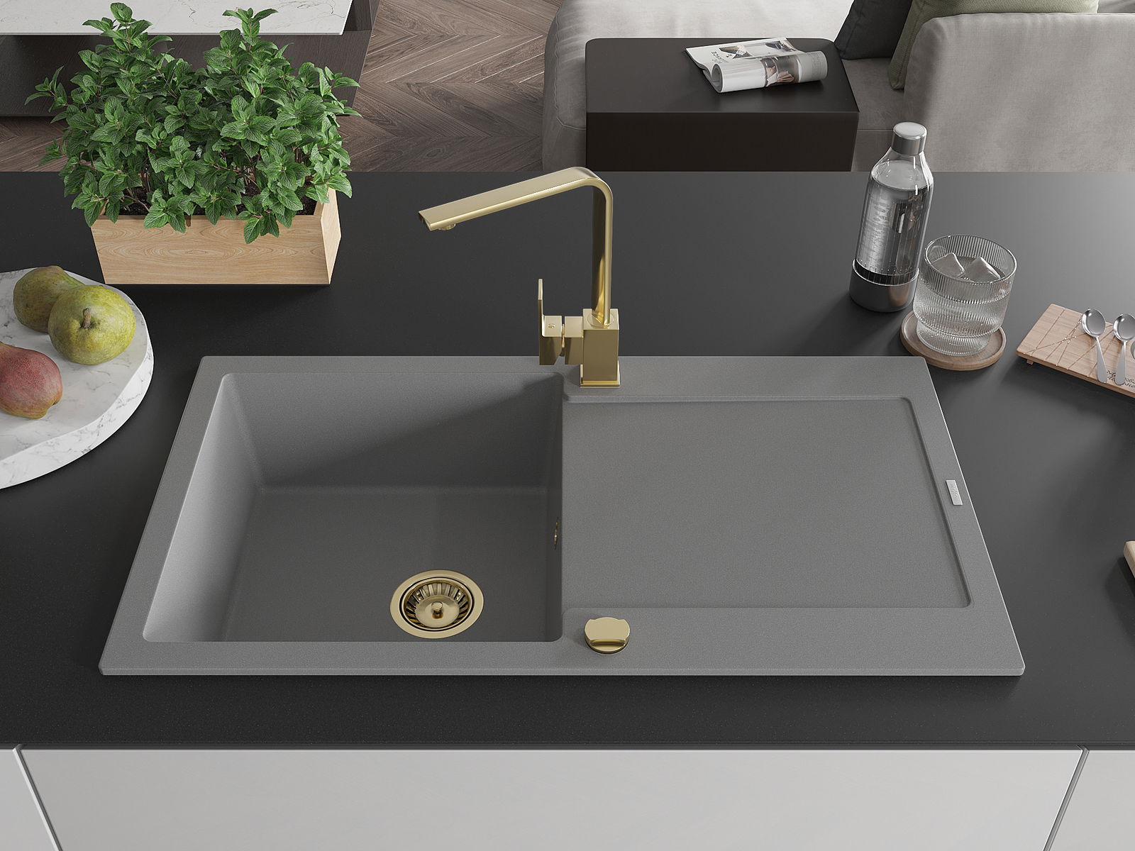 Mexen Leo granieten spoelbak met 1 kom met afdruiprek en keukenmengkraan Rita, grijs - 6501-71-670300-50