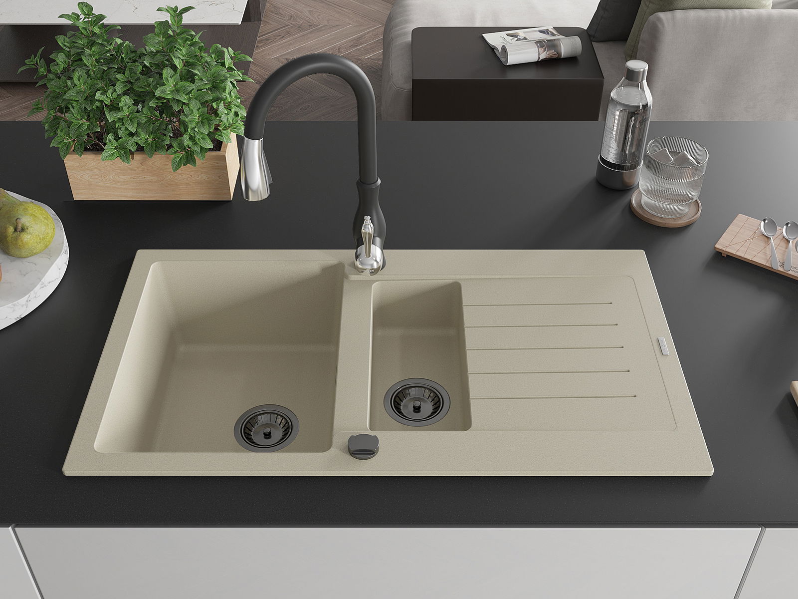 Mexen Matias granieten spoelbak 1,5-kamer met druiprek en keukenmengkraan Savita, beige - 6502-69-672601-70