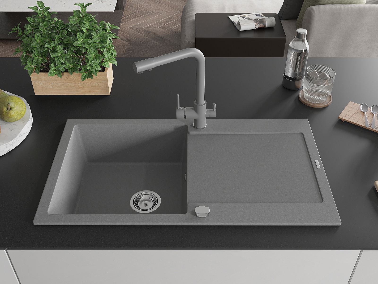 Mexen Leo granieten spoelbak 1-komors met afdruiprek en keukenkraan Duero, grijs - 6501-71-671600-71