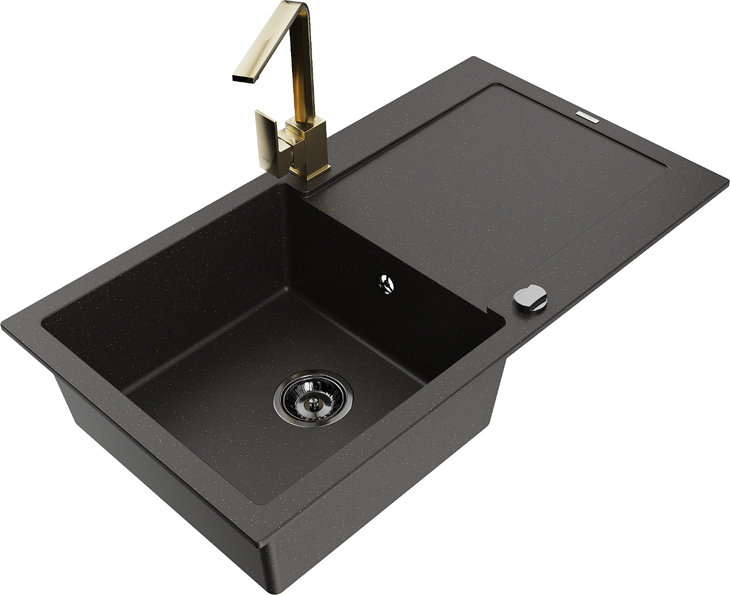 Mexen Leo granieten gootsteen 1-komers met afdruiprek en keukenmengkraan Rita, zwart/gouden metallic - 6501-75-670300-50-B