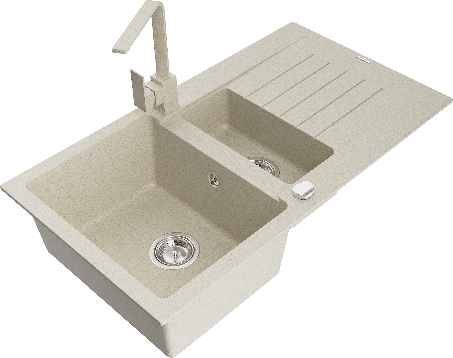 Mexen Matias granieten gootsteen 1,5-komors met afdruiprek en keukenmengkraan Rita, beige - 6502-69-670300-69