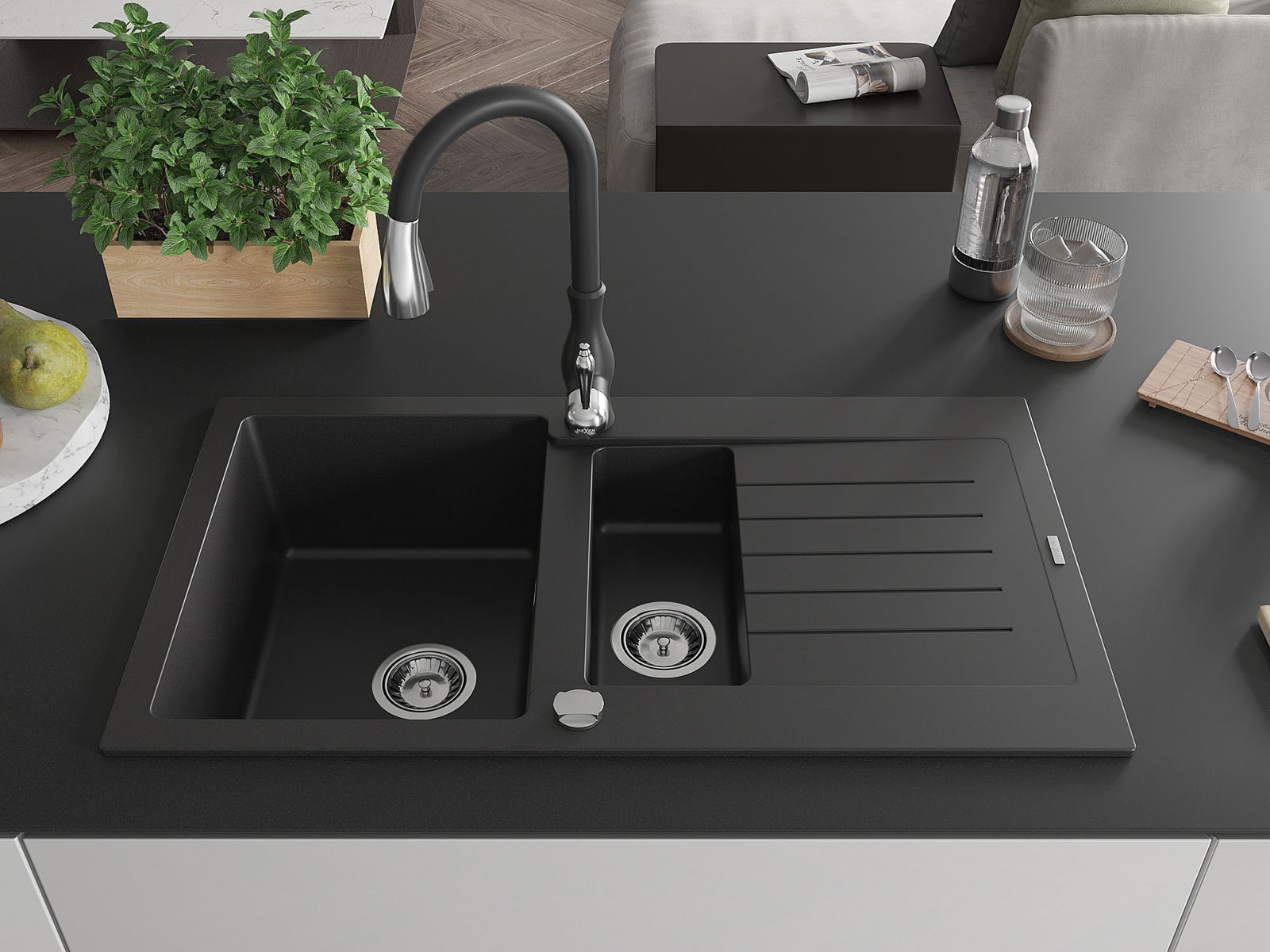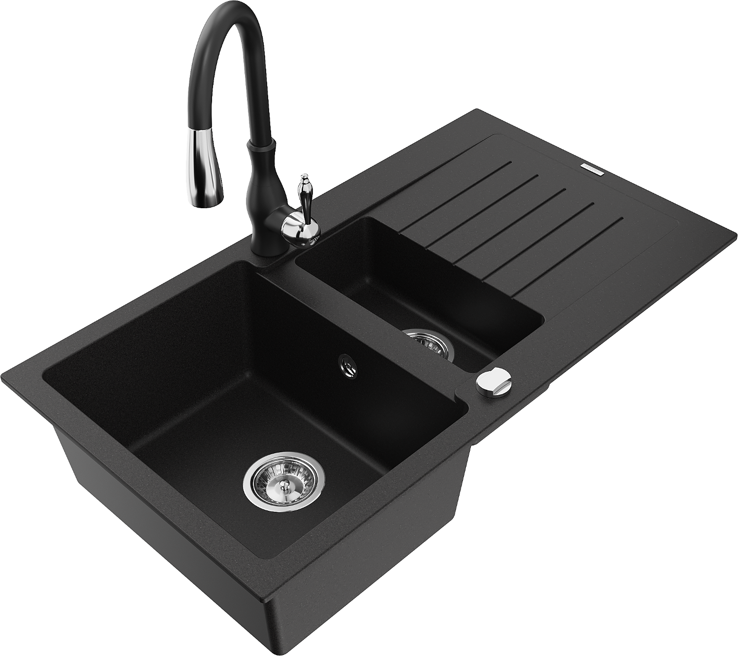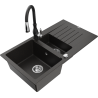 Mexen Matias granieten spoelbak 1,5-komponent met afdruiprek en keukenmengkraan Savita, zwart - 6502-77-672601-70