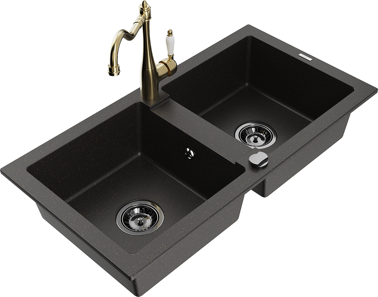 Mexen Mario granieten gootsteen 2-delig met keukenkraan Carla, zwart/goud metallic - 6504-75-670700-50-B