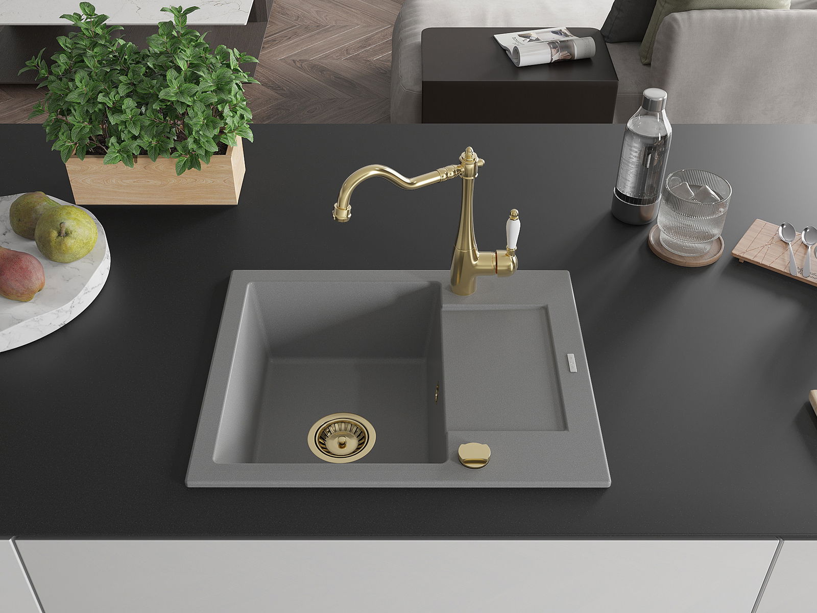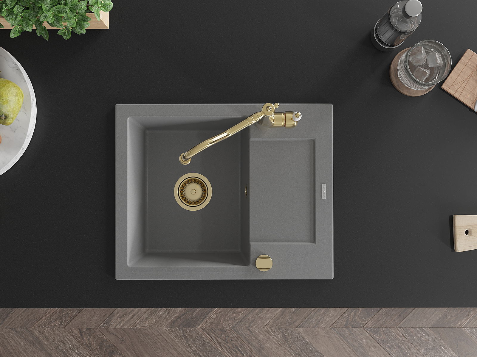 Mexen Enzo granieten gootsteen 1-komorige met afdruiprek en keukenmengkraan Carla, grijs - 6506-71-670700-50