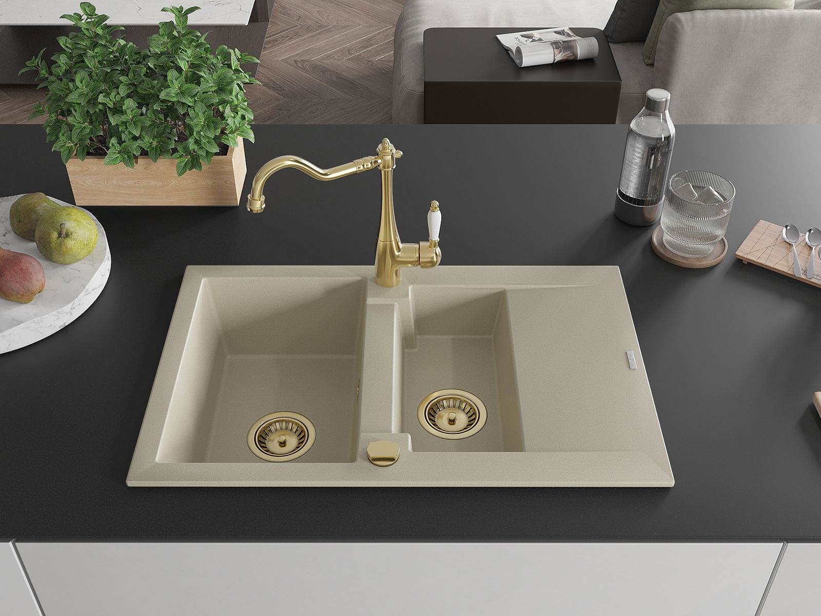 Mexen Gaspar granieten spoelbak 1,5-komorige met afdruiprek en keukenmengkraan Carla, beige - 6507-69-670700-50