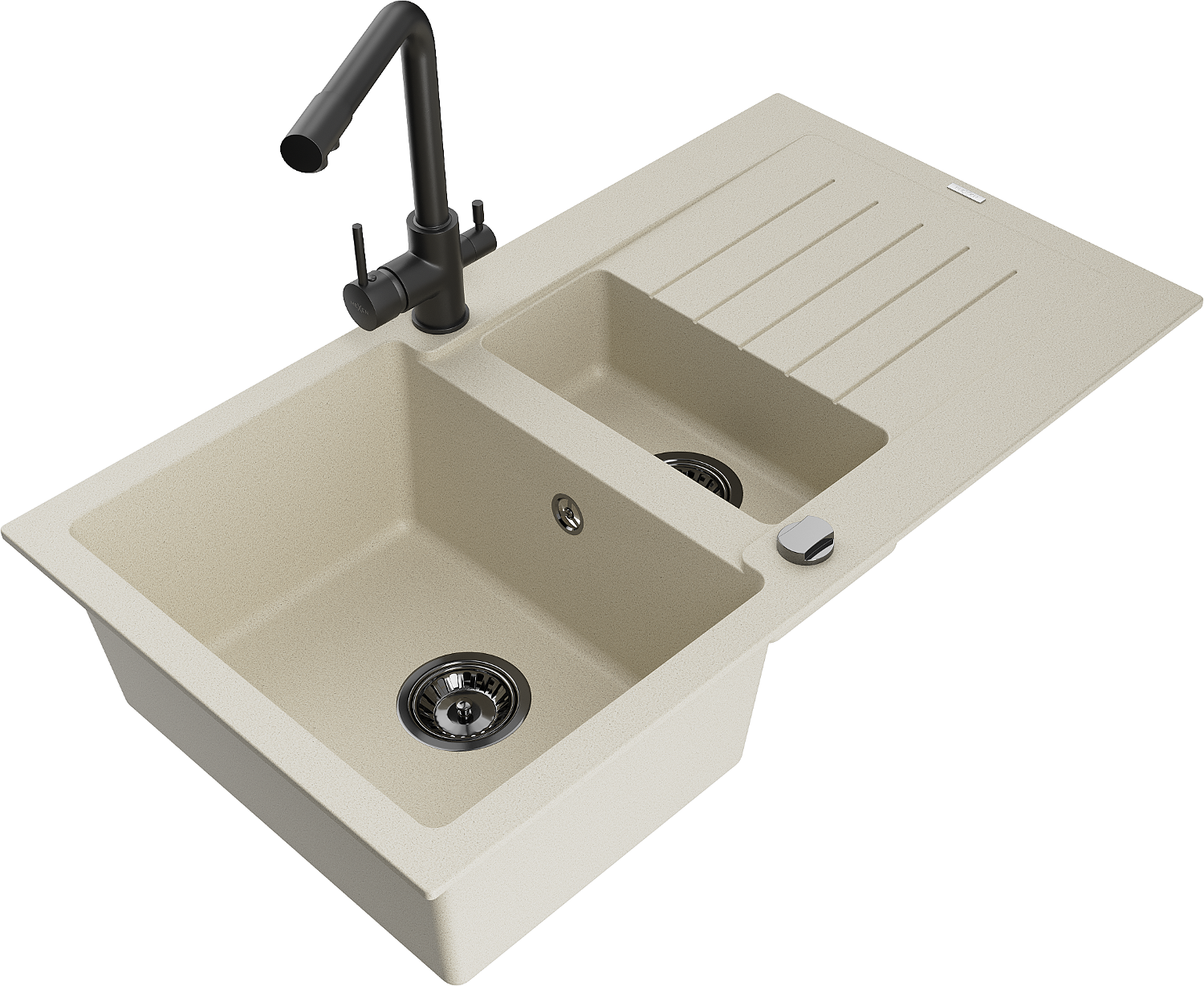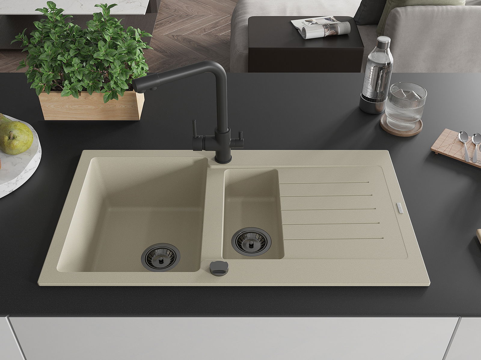 Mexen Matias granieten gootsteen 1,5-komerig met afdruiprek en Duero keukenmengkraan, beige - 6502-69-671600-70