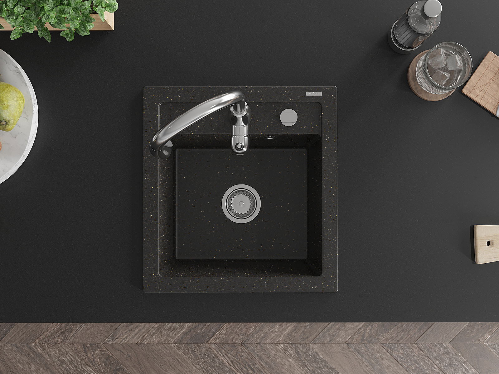 Mexen Vito granieten gootsteen 1-komorige met keukenkraan Savita, zwart/gouden metallic - 6503-75-672601-00
