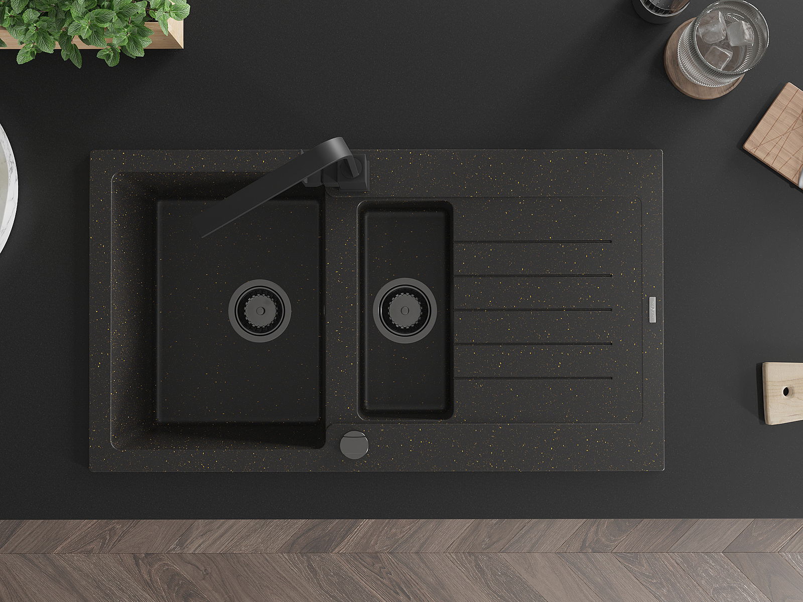 Mexen Matias granieten spoelbak met 1,5 kamers met afdruiprek en keukenmengkraan Rita, zwart/goud - 6502-75-670300-70-B