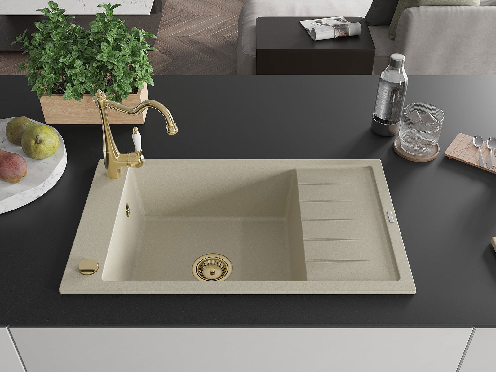 Mexen Elias granieten spoelbak 1-komorige met afdruiprek en keukenmengkraan Carla, beige - 6511-69-670700-50