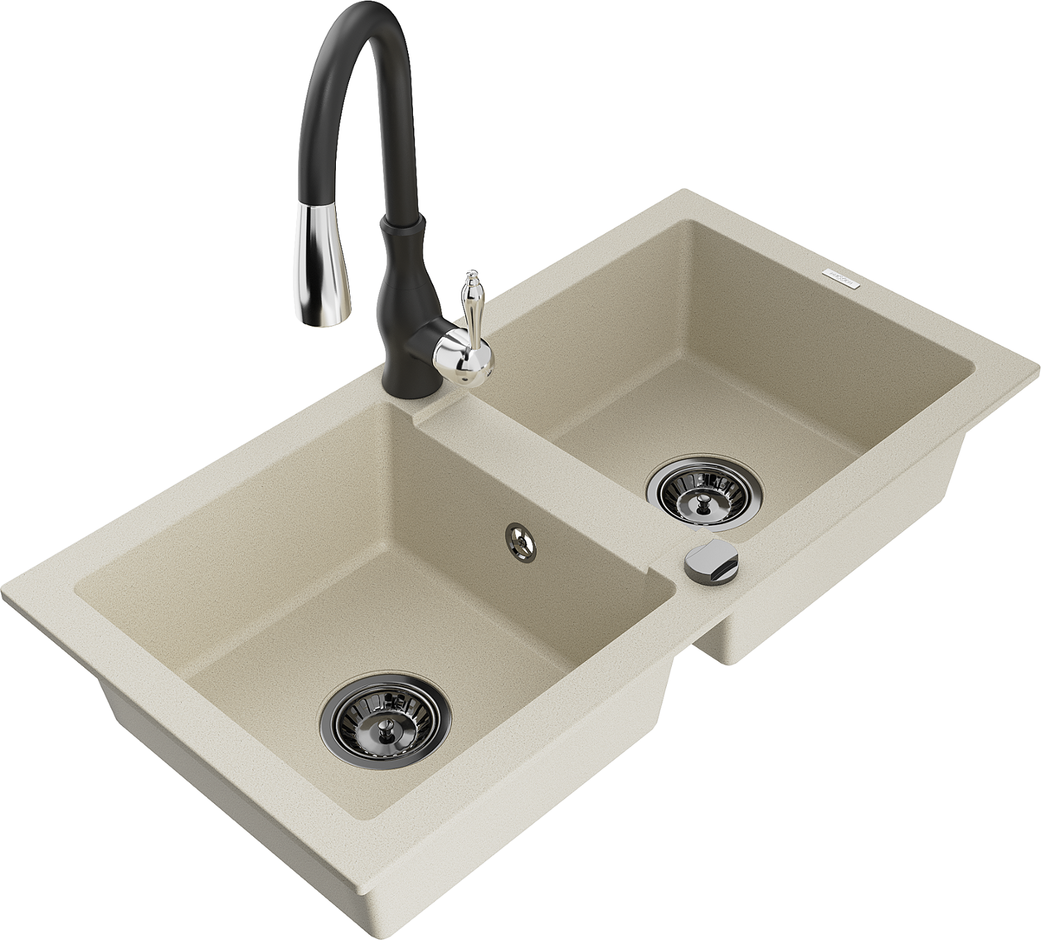 Mexen Mario granieten gootsteen met 2 kommen en keukenmengkraan Savita, beige - 6504-69-672601-70