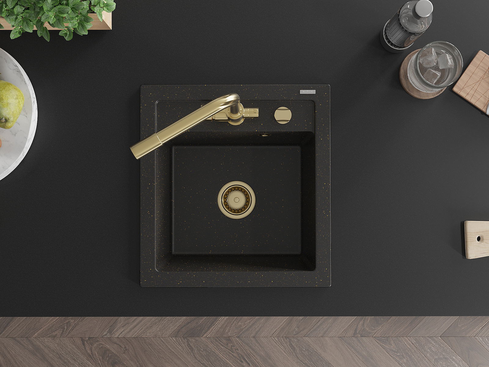 Mexen Vito granieten gootsteen met 1 bak en Duero keukenmengkraan, zwart/gouden metallic - 6503-75-671600-50