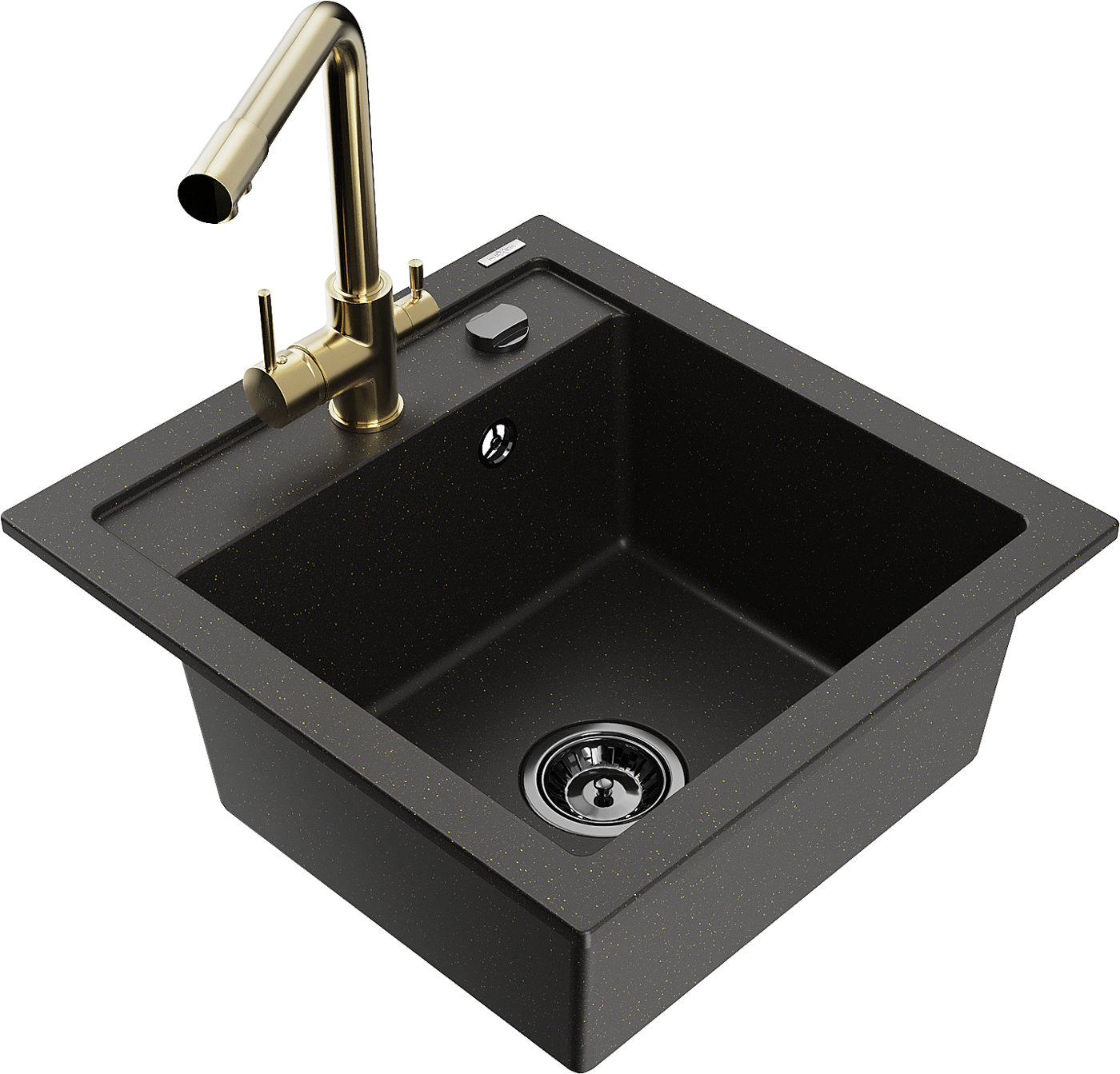 Mexen Vito granieten gootsteen 1-komorige met keukenkraan Duero, zwart/gouden metallic - 6503-75-671600-50-B