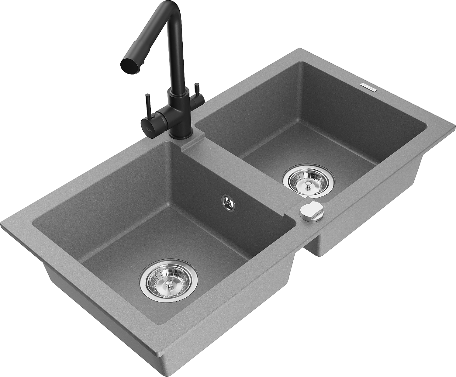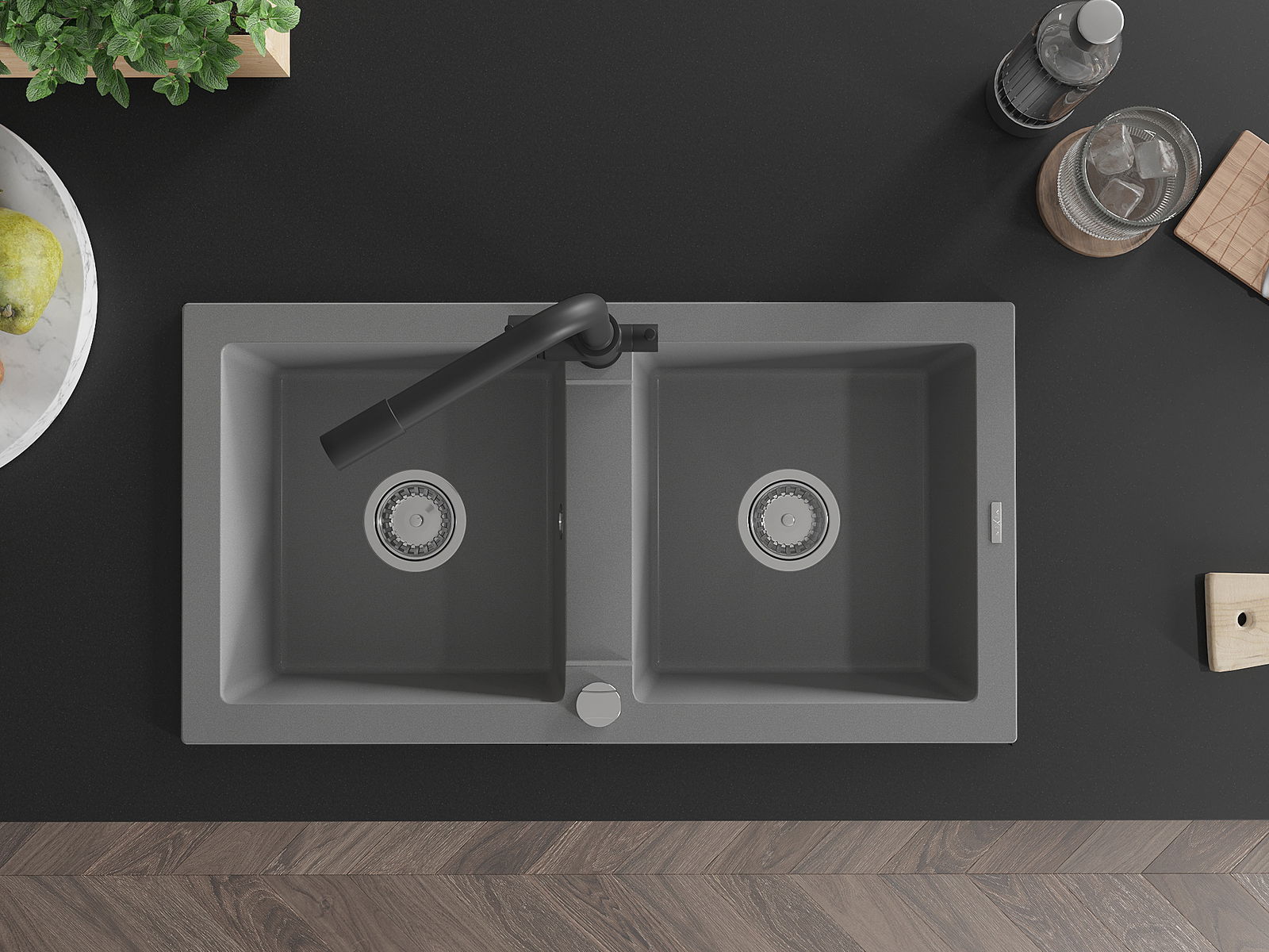 Mexen Mario granieten gootsteen 2-kamers met keukenkraan Duero, grijs - 6504-71-671600-70