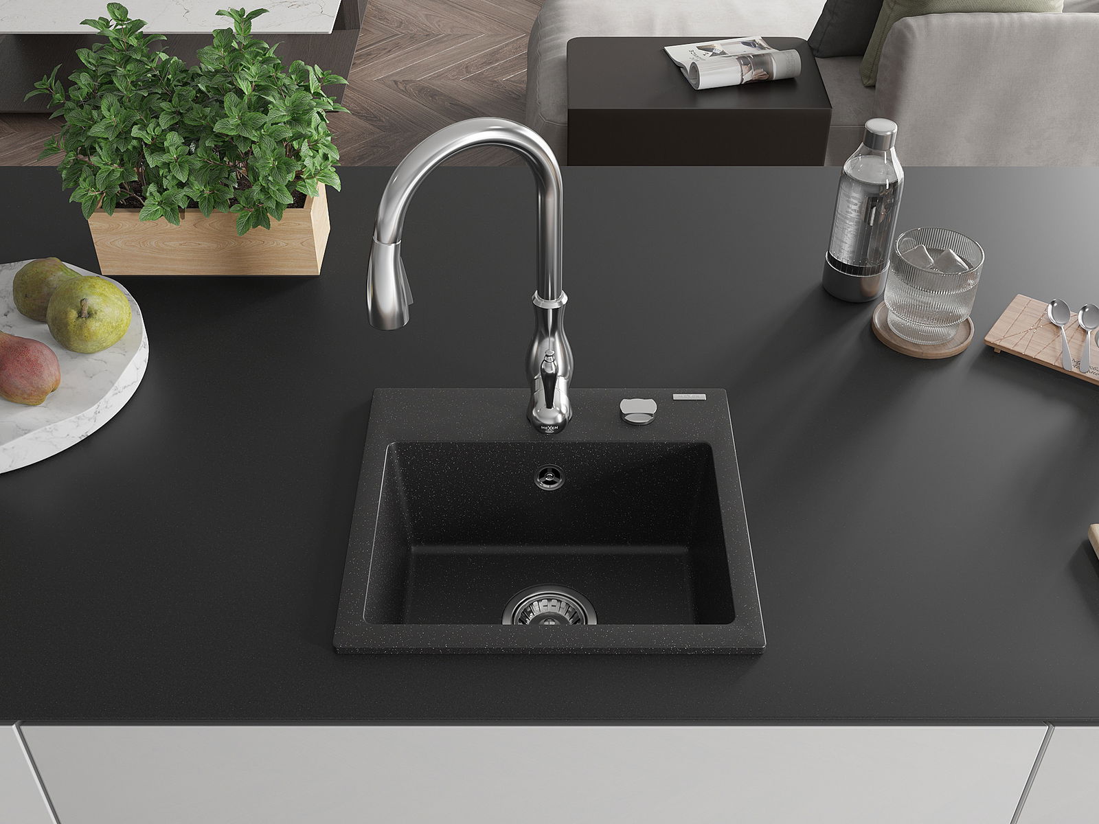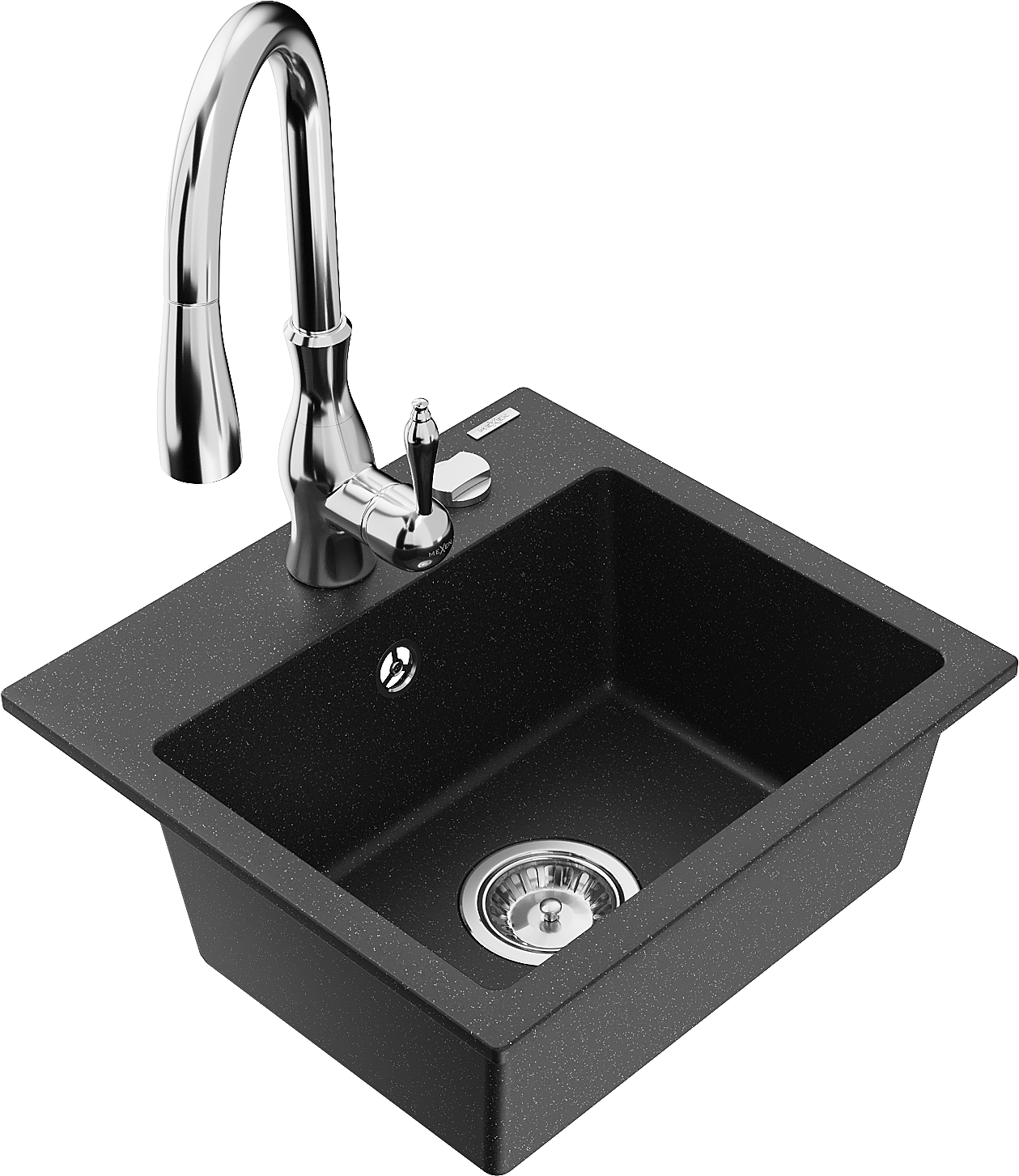 Mexen Milo granieten spoelbak met 1 bak en keukenkraan Savita, zwart/zilver metallic- 6505-73-672601-00