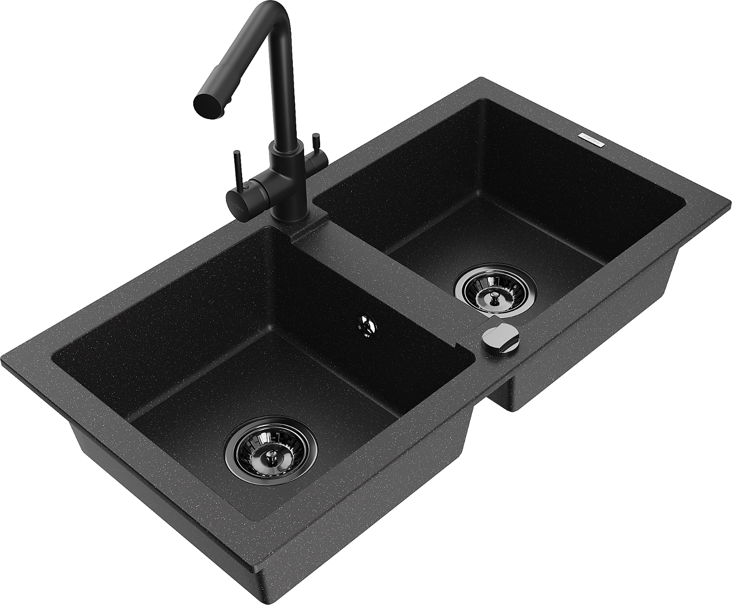 Mexen Mario granieten gootsteen 2-kamer met keukenmengkraan Duero, zwart/zilveren metallic - 6504-73-671600-70-B