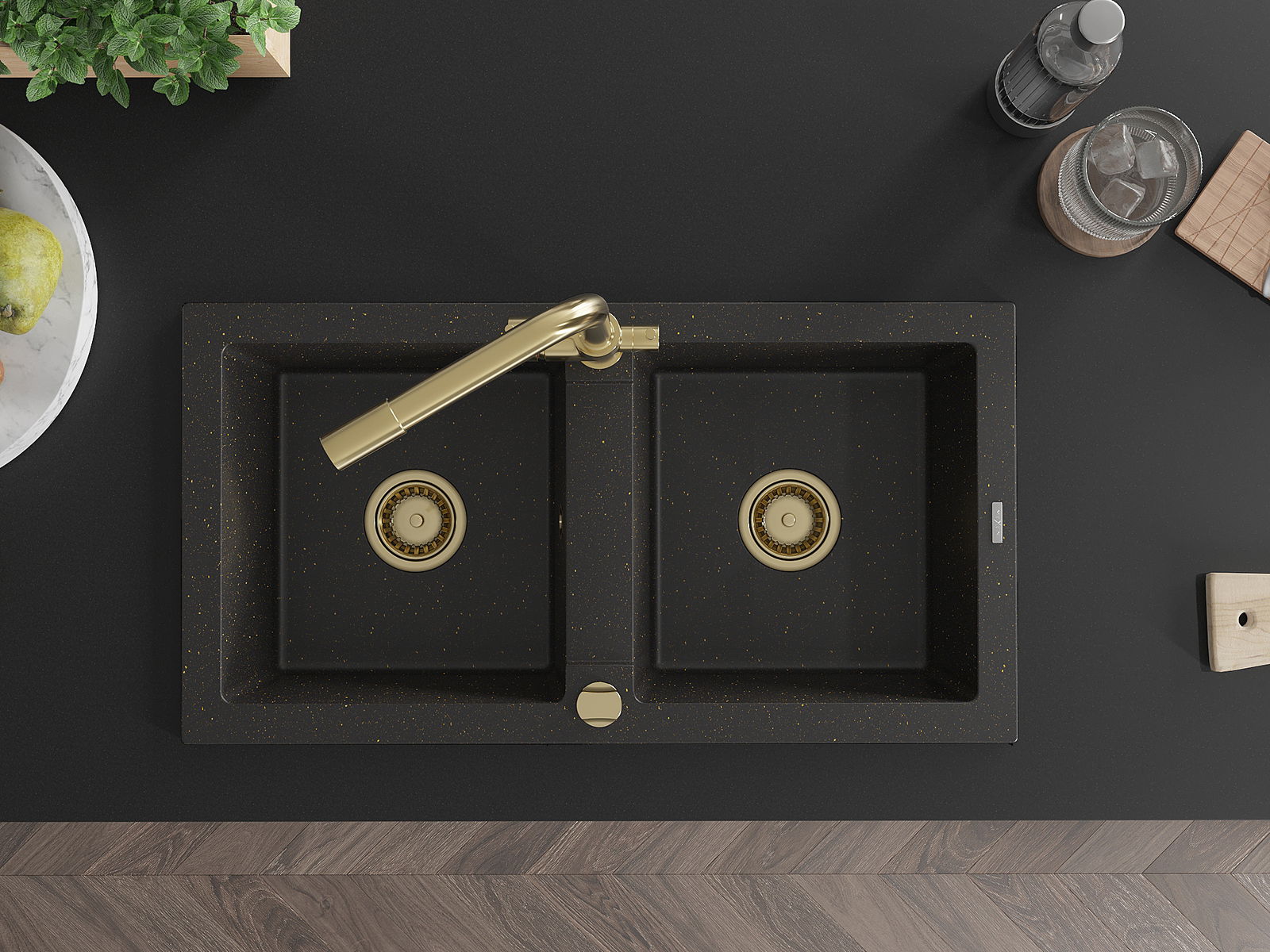 Mexen Mario granieten spoelbak met 2 kommen en Duero keukenkraan, zwart/goud metallic - 6504-75-671600-50