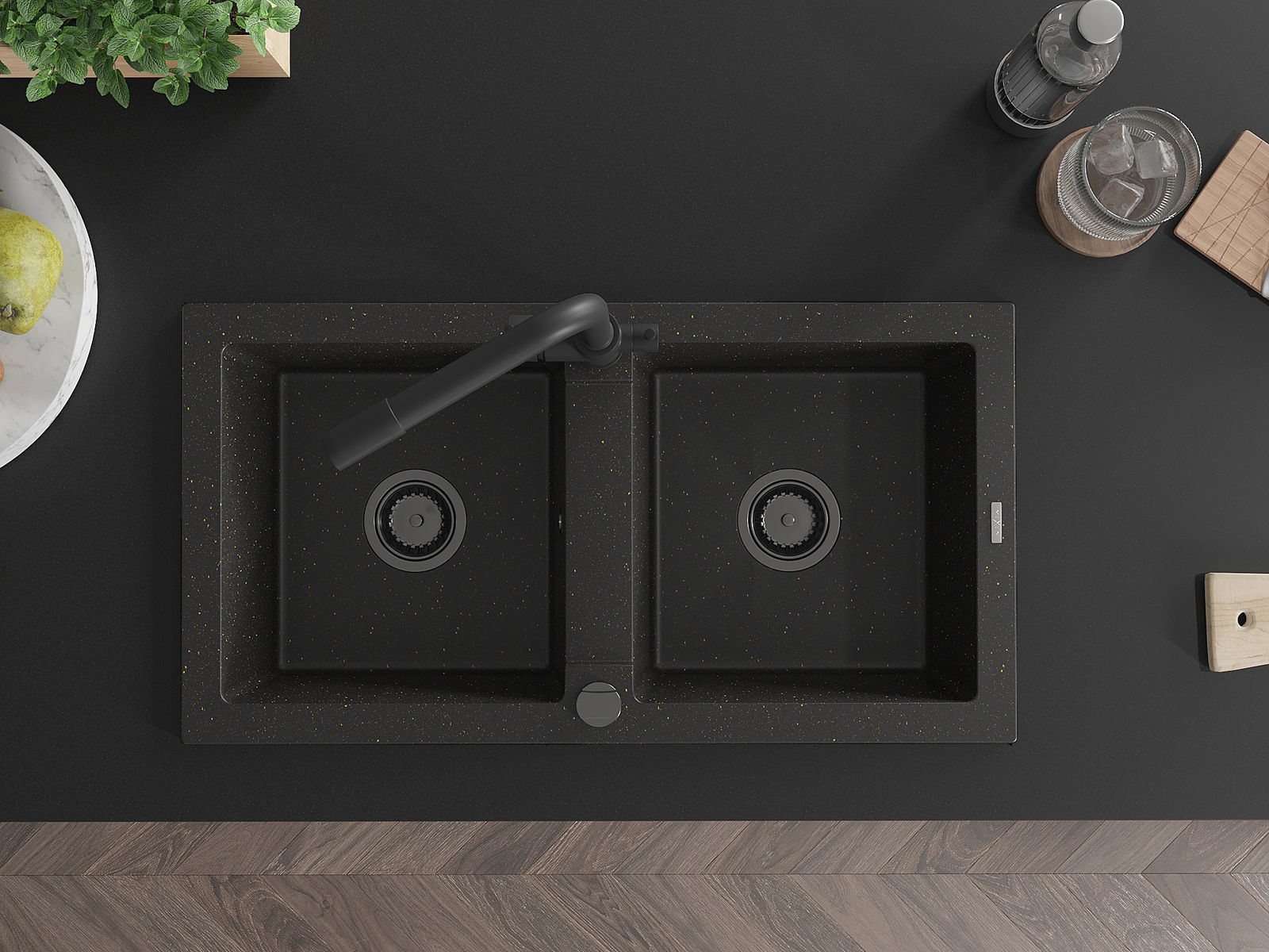 Mexen Mario granieten gootsteen 2-komorige met keukenmengkraan Duero, zwart/goud metallic - 6504-75-671600-70-B