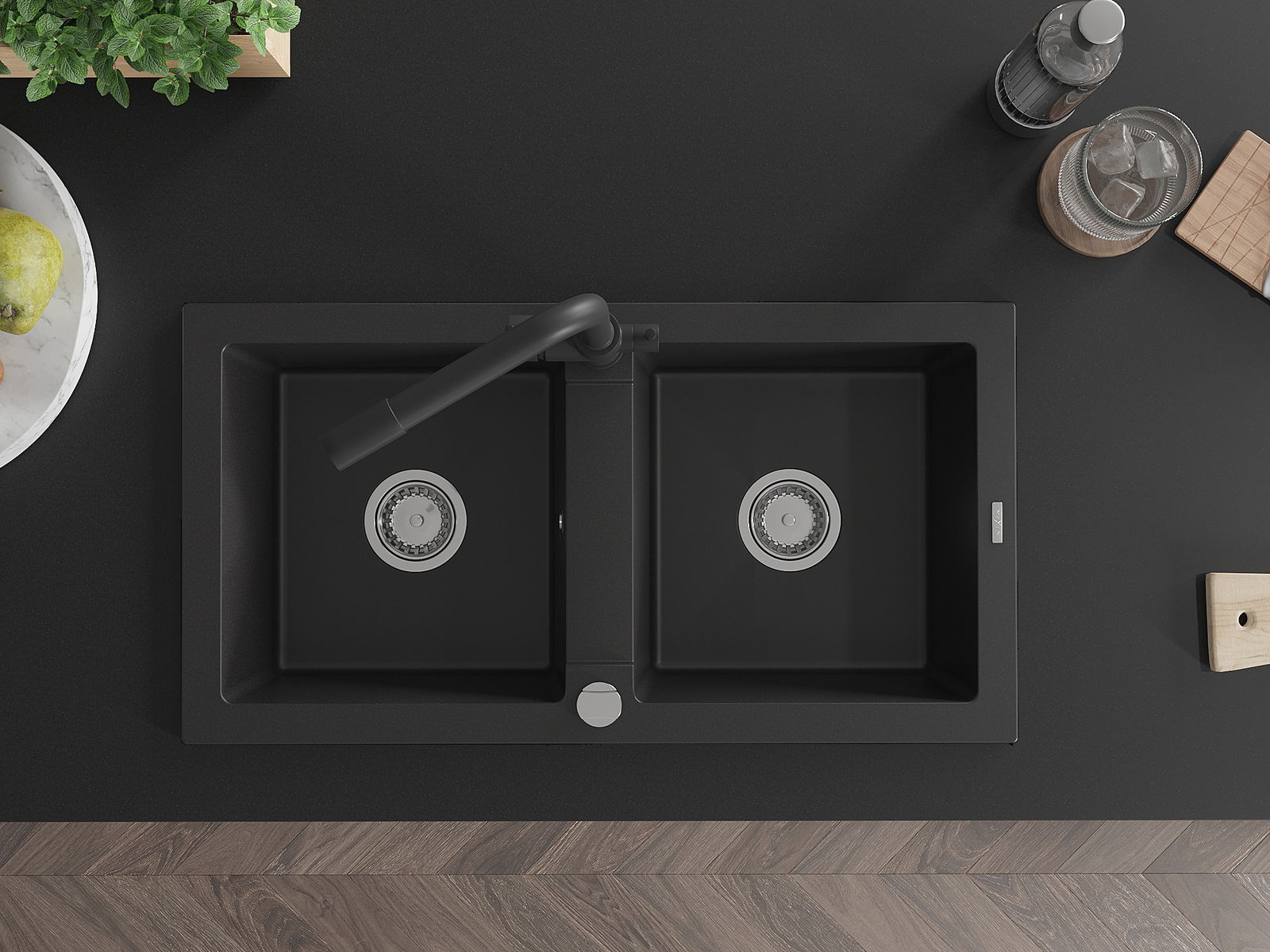 Mexen Mario granieten spoelbak 2-kamer met keukenkraan Duero, zwart - 6504-77-671600-70